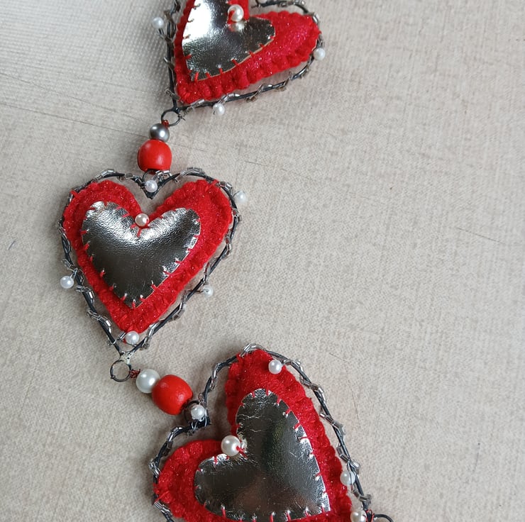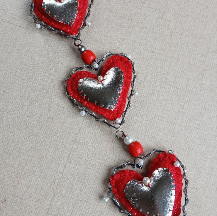 A unique, one off hanging heart decoration. Three red felt and appliqued silver hearts combined with wire and beads. The length of the hanging from the first heart to the last bead is approx 29 inches. There is a beaded loop at the top for hanging.