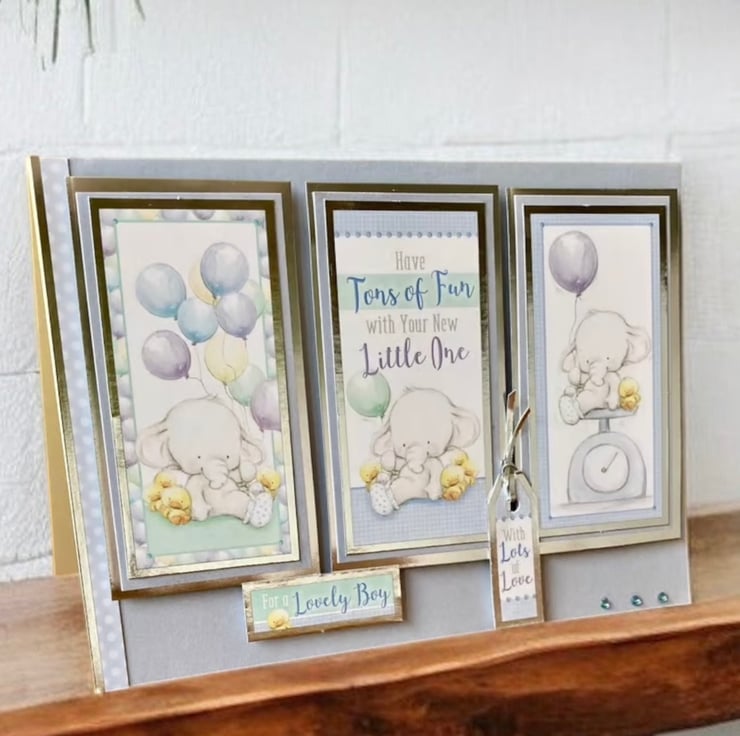 The cream base card has been layered with a pale blue paper. Three toppers that are layered with silver mirror card have been added, these feature cute little elephants and the sentiment Have Tons of Fun with your Little One. Two additional toppers with the words for a lovely boy with lots of love finish the card.