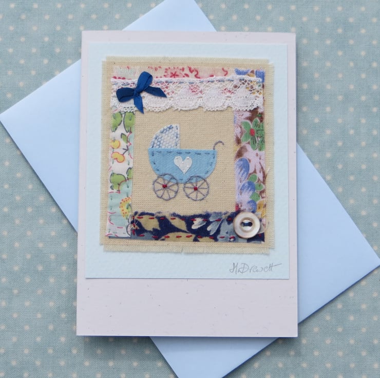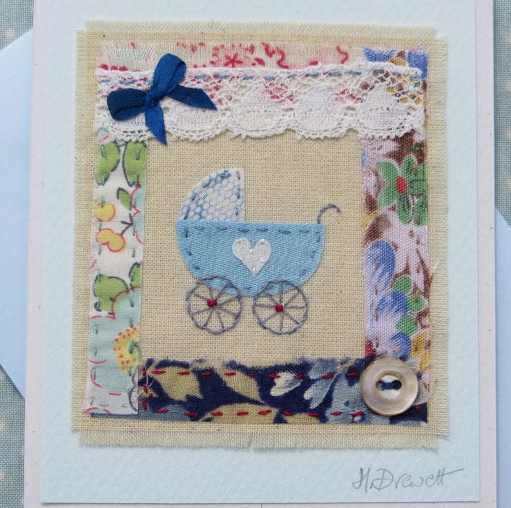 Little pram embroidery on card, vintage fabrics, for a precious new baby boy