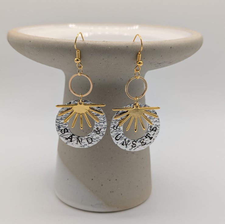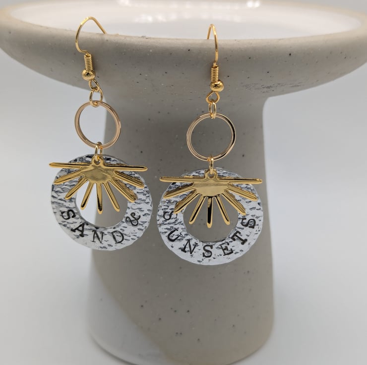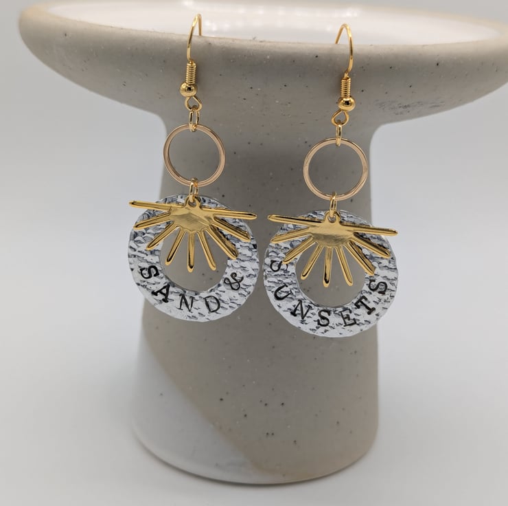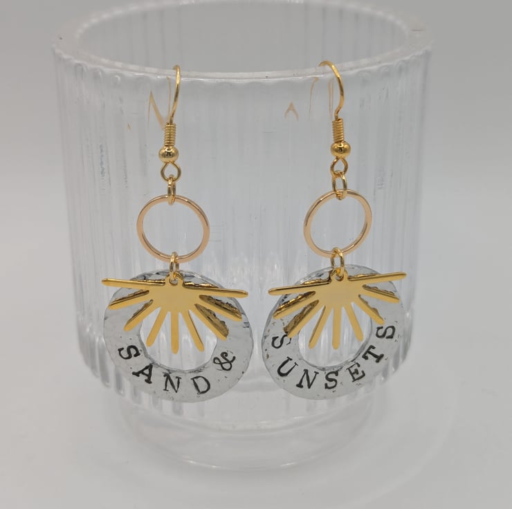 They are made with gold plated earring wires and gold plated solid circle connectors with aluminium hand stamped and hammered washers with 'Sand & Sunsets' wording and gorgeous gold plated sunburst charms on top.