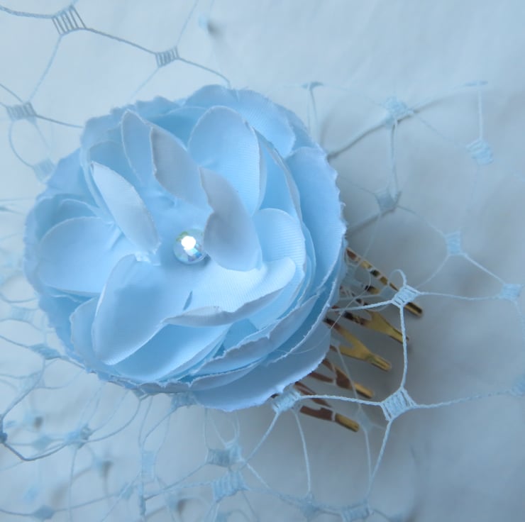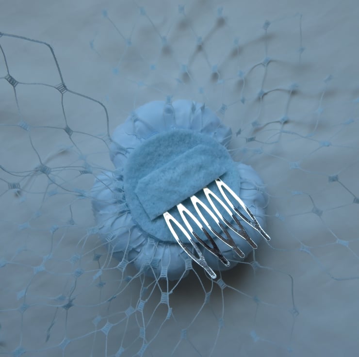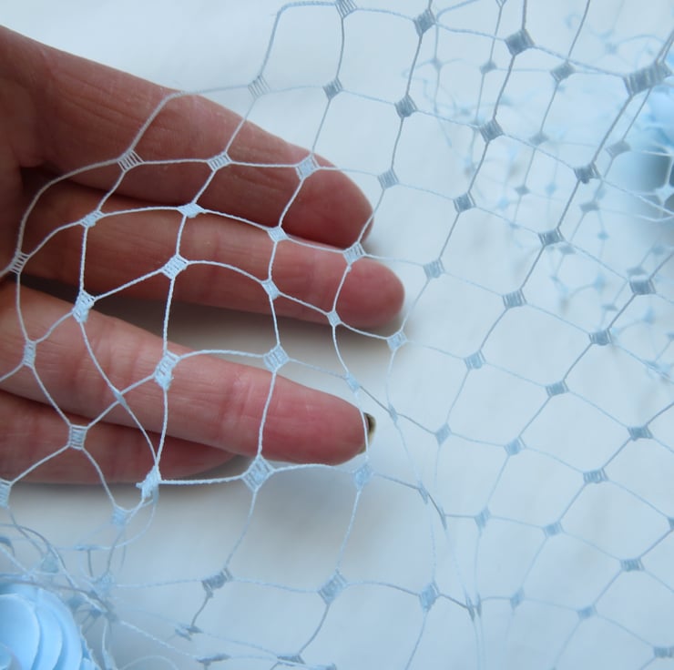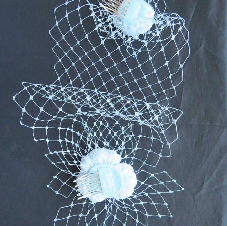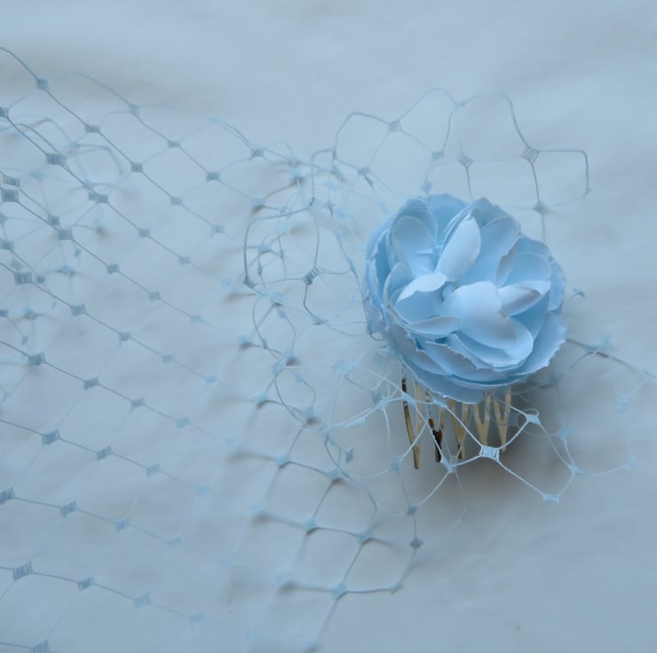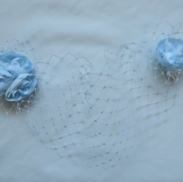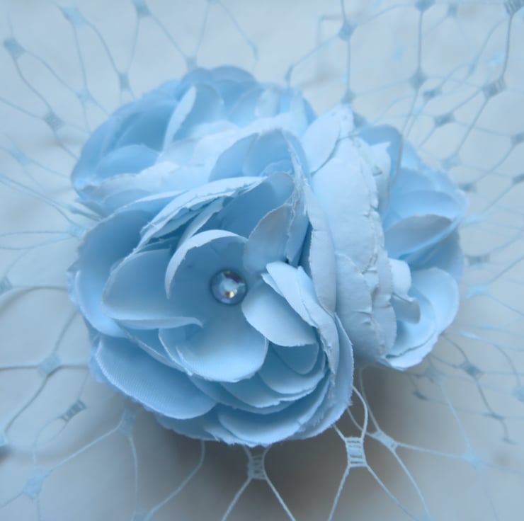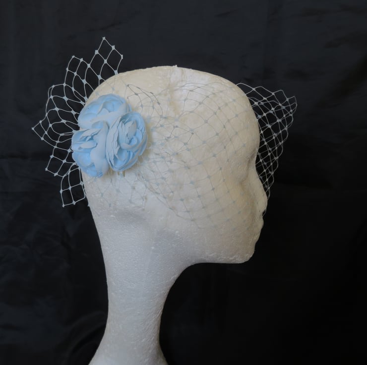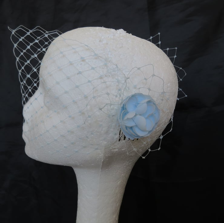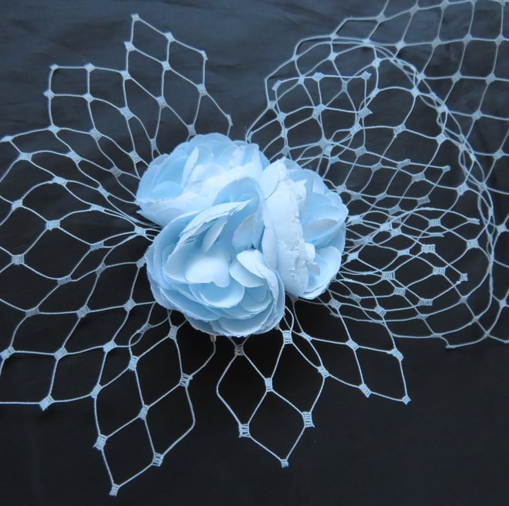 Created with a piece of rare pale ice blue vintage merry widow veiling, which is stiffer than normal veiling.