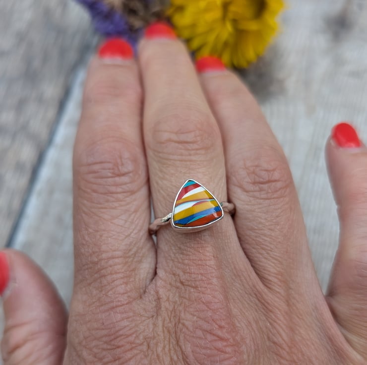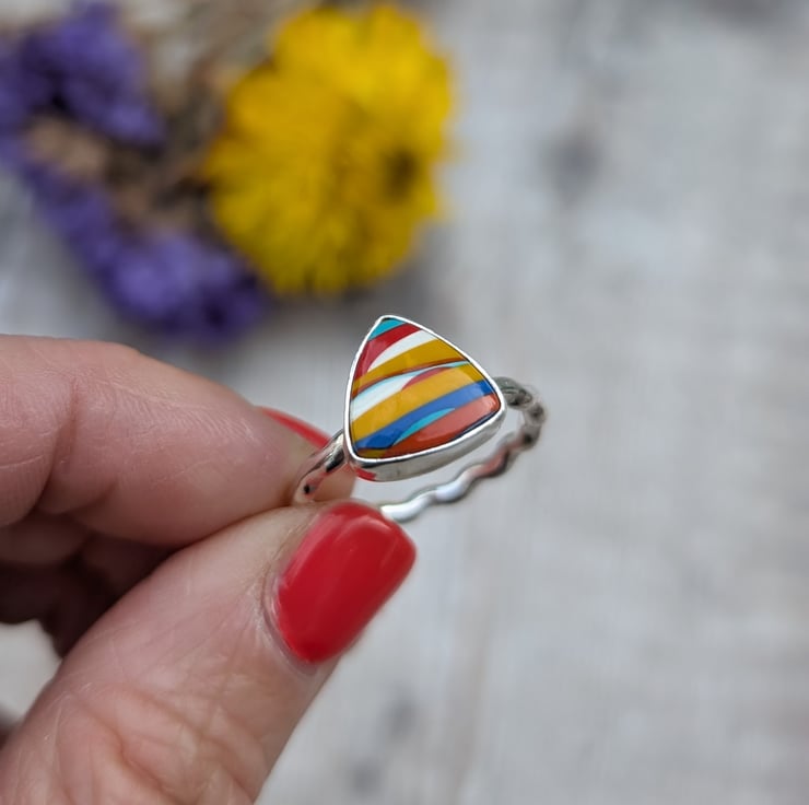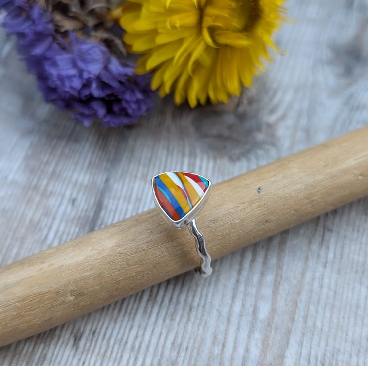 This handmade silver ring features a vibrant Surfite stone set in recycled sterling silver. The Surfite, made from layers of leftover surfboard resin, creates striking stripes of orange, red, yellow, blue and green—each one completely unique.