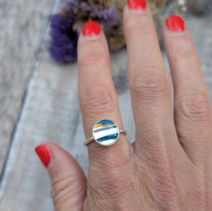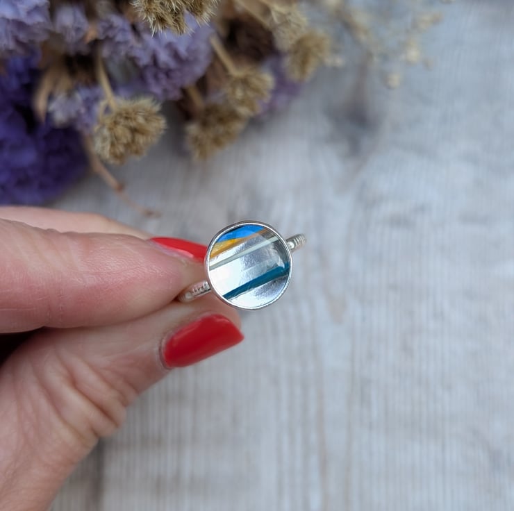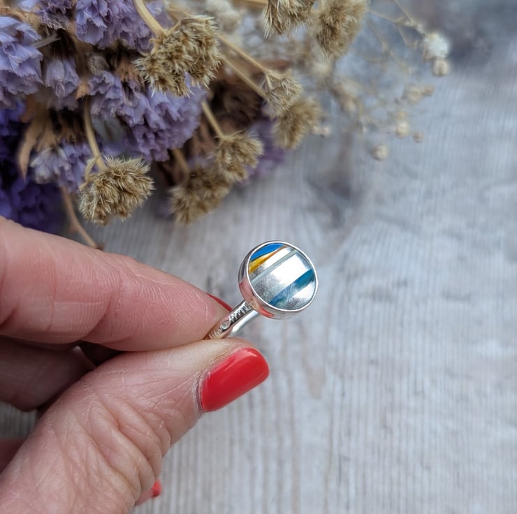 This handmade ring features a striking round Surfite stone set in recycled sterling silver. The Surfite, a vibrant and colourful by-product of surfboard making, gives each piece its own distinct layered pattern—this one combining bright blue, warm amber and white tones in a bold striped effect.