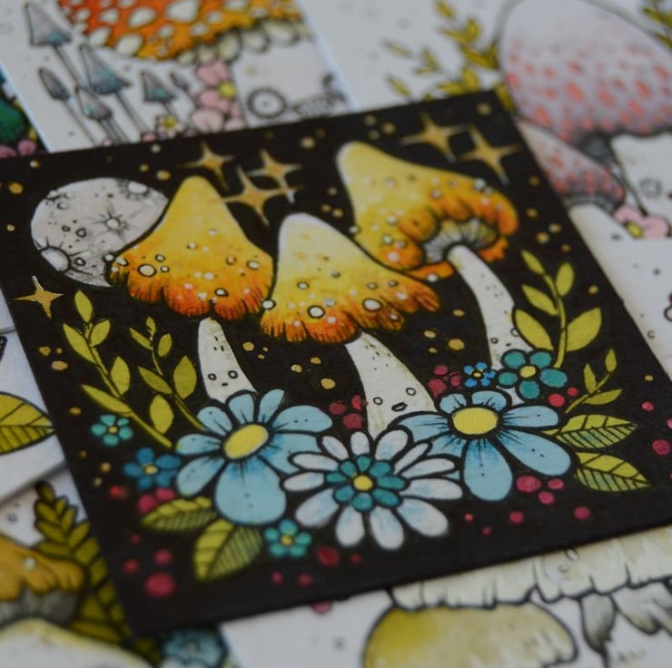 this toxic trio of spotty orange agarics are growing under a midnight silver moon, and were drawn on day 5.