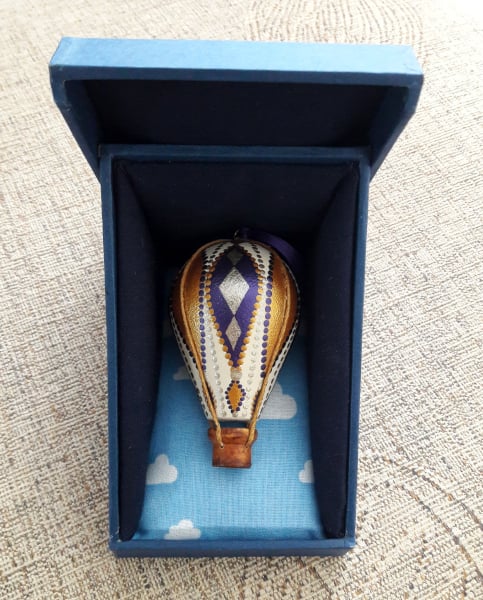 My miniature hot air balloons are made with air dry clay, sanded down into shape and then hand painted with acrylic paint, each with a unique design. I will always do a brand new design for each one, no balloon will be replicated.