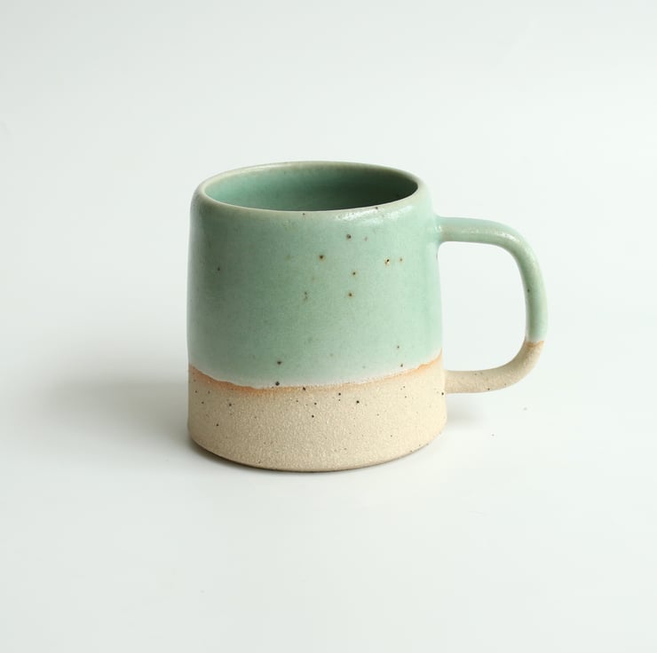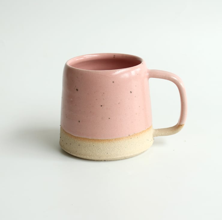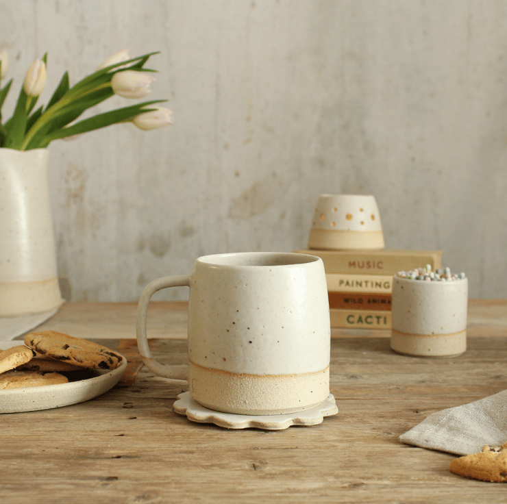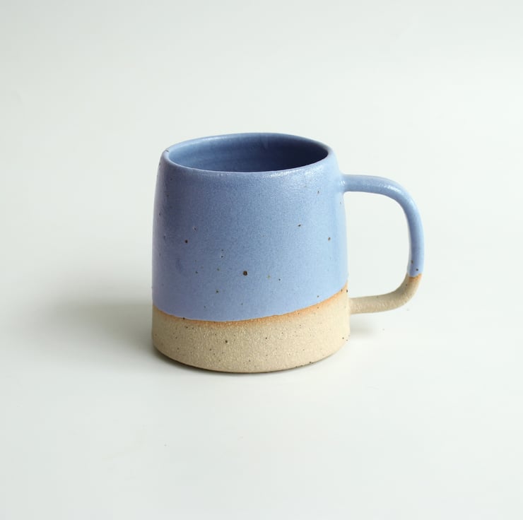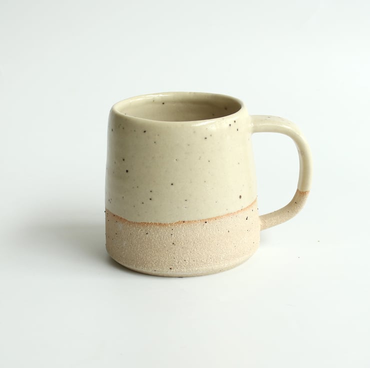 The mug has been designed to have a comfortable and sturdy grip. The flared base and generous width of the mug allows for a hearty amount of liquid, and the internal glaze and nature of stoneware clay retains temperature.