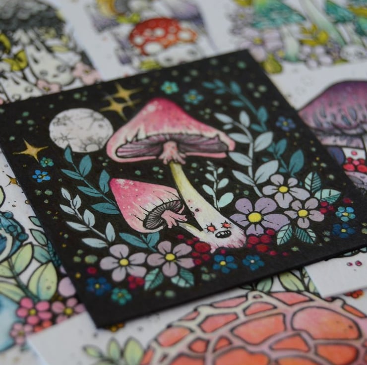 it is hand drawn in ink, and coloured with art pens, pencils and watercolour paint, on a lovely textured watercolour paper. (300gsm)