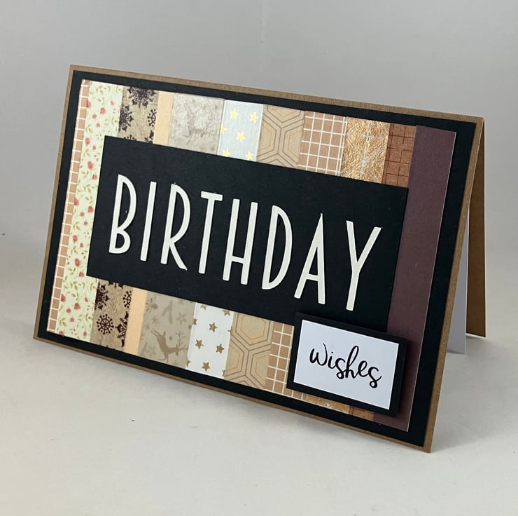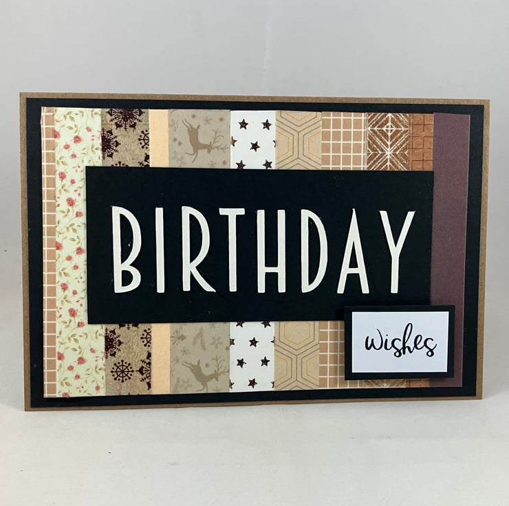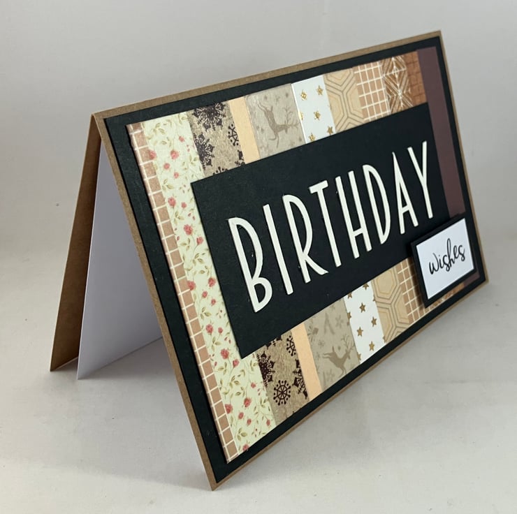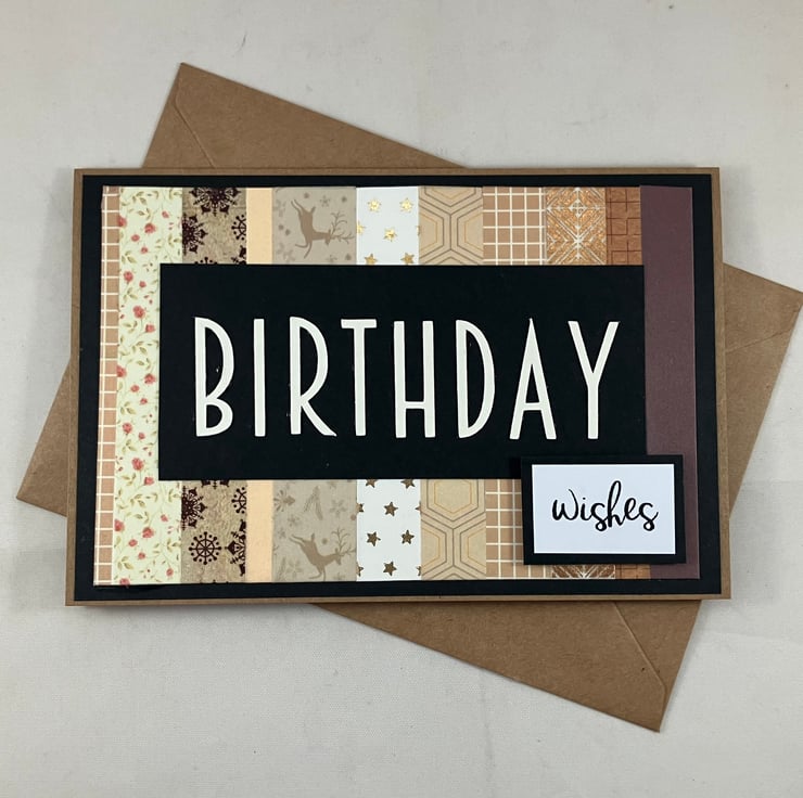 A6 kraft, landscape birthday card created using strips of washi tape in neutral shades of brown and cream. The letters spelling 'birthday' have been cut from white card and mounted on a black card panel. The word 'wishes' has been printed on white card and also mounted on black card.