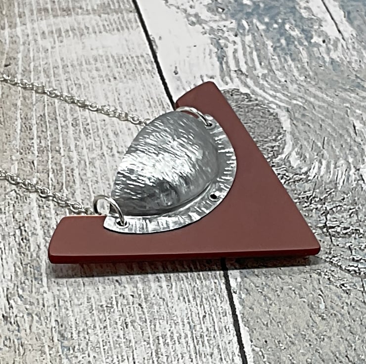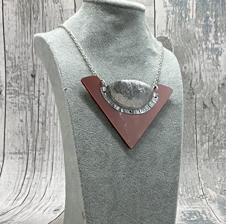 Handmade necklace made from recycled aluminium drink can complemented with the addition of a cream acrylic shape. The design focuses on the metal base of the can incorporating the domed shape which I have cut, shaped and hammered texture too giving this necklace it’s unique and one-of-a-kind individuality. The acrylic is cut by hand into a triangle design in a rose gold colour, this is riveted to the metal using aluminium tubing. Eco-friendly material and lightweight and comfortable to wear for all occasions.
