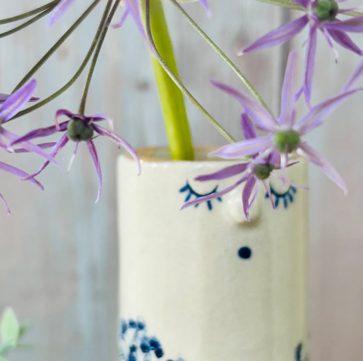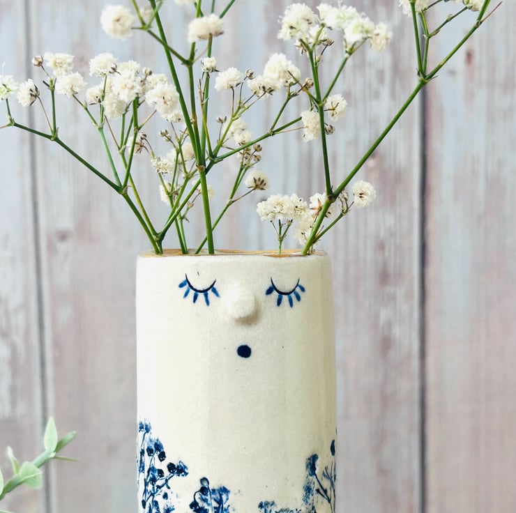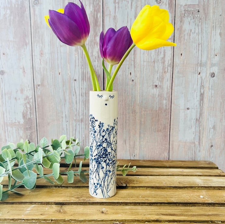 Each vase is pressed with a plants and flowers from my garden. This particular vase is pressed with gypsophelia. They are all finished with a 24k gold lustre rim.