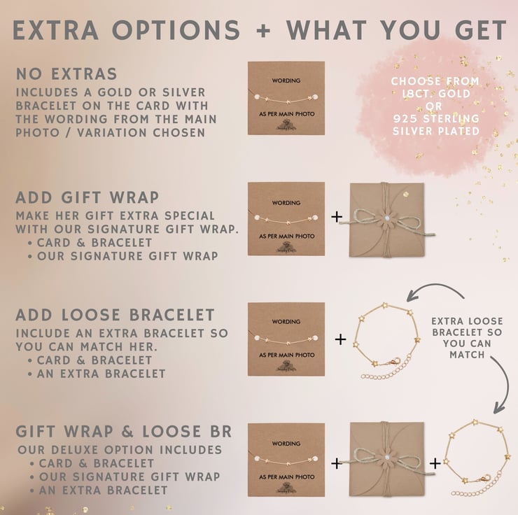 This sparkly 18 ct Gold plated star bracelet Silver plated star bracelet comes attached to rustic kraft card with the sentimental message Best friends are like stars, you don't always see them." "But you know they are always there" (you can choose alternative to 'best friend' we have a lot of options.)