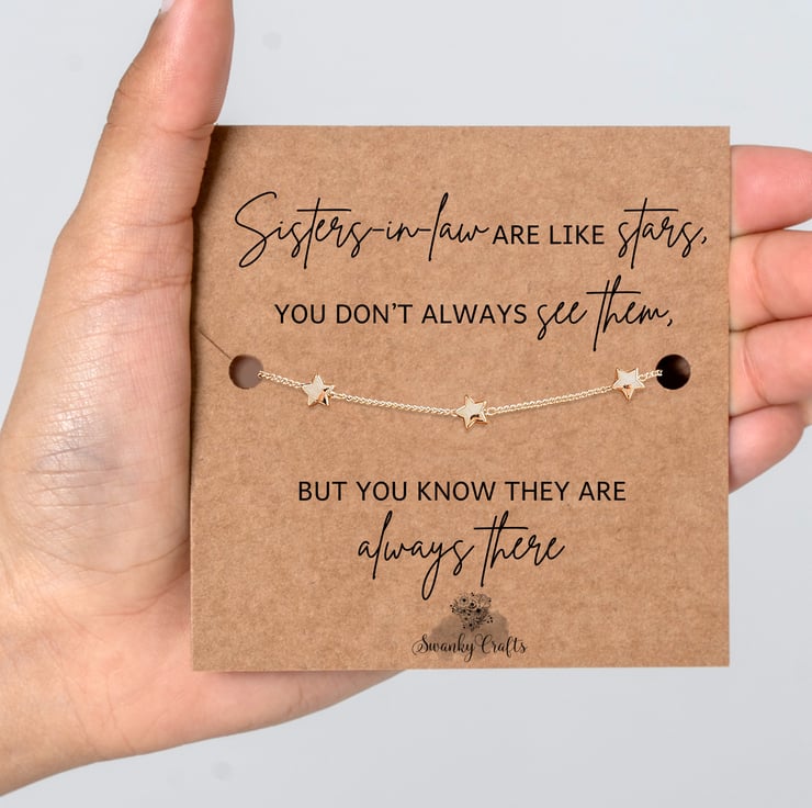 This sparkly 18ct GOLD plated 925 STERLING SILVER Plated star bracelet comes attached to rustic kraft card with the sentimental message Sisters in law by chance" "Friends by choice"