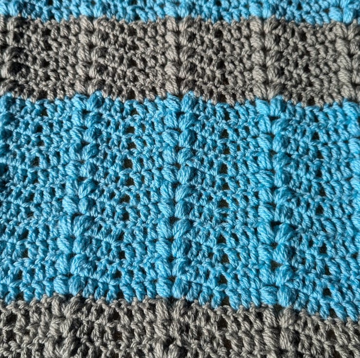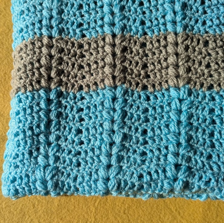 We have lovely baby blue gray crochet blanket, size 80/85 cm.