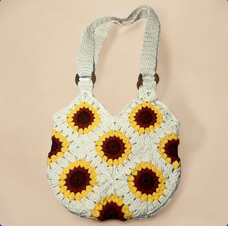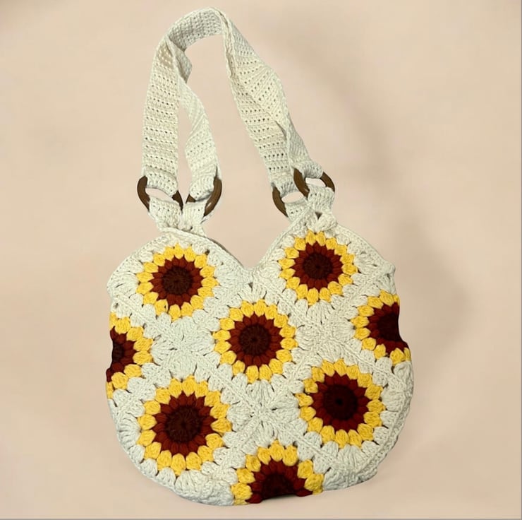 Made with granny squares bright colourful sunflower designs perfect for spring and summer take away traveling one of a kind