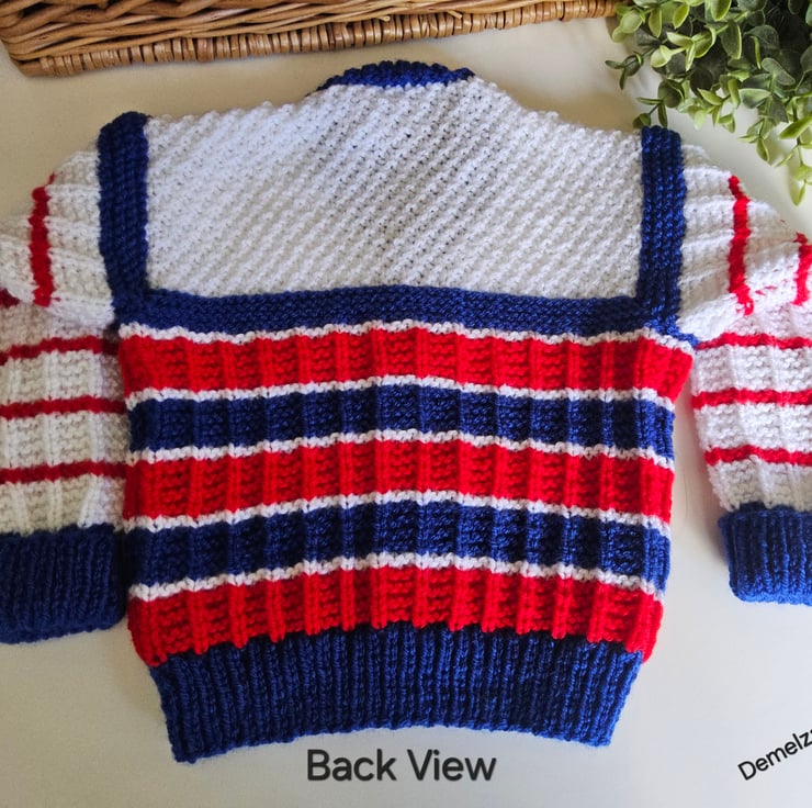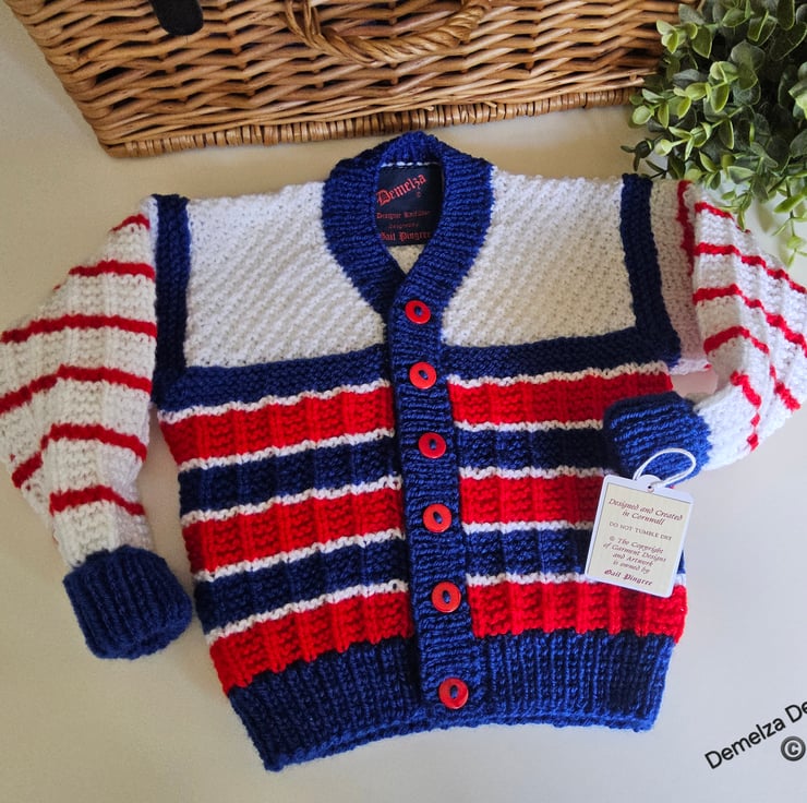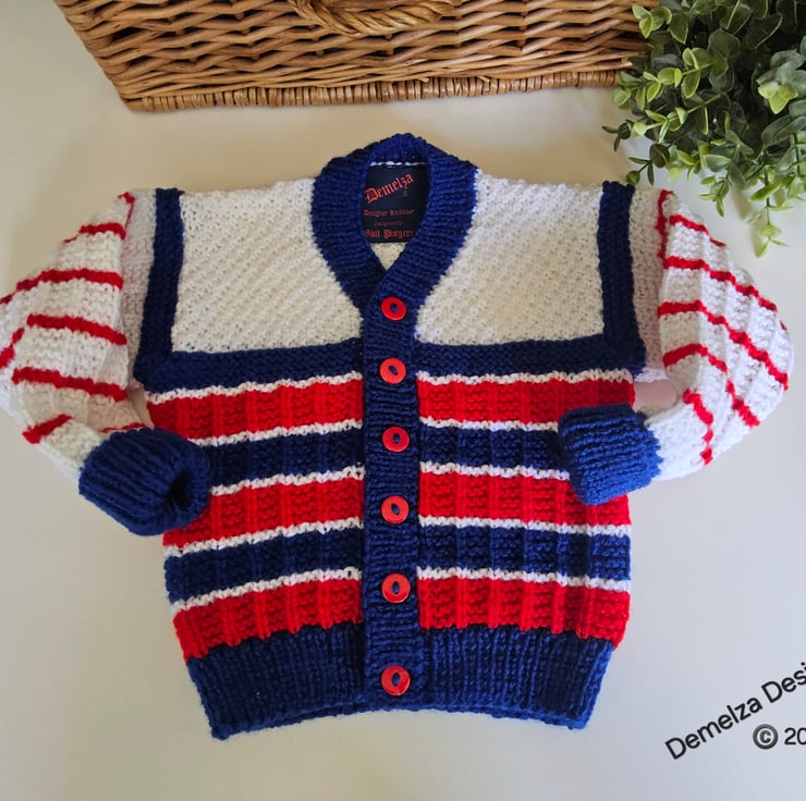 This cosy warm hand knitted toddler boy's cardigan has been lovingly designed and hand crafted in Cornwall using quality branded premium machine washable acylic yarns. The colours are very trendy to go with any boys wardrobe collection. The flat bright red buttons compliment the coloured yarns used.