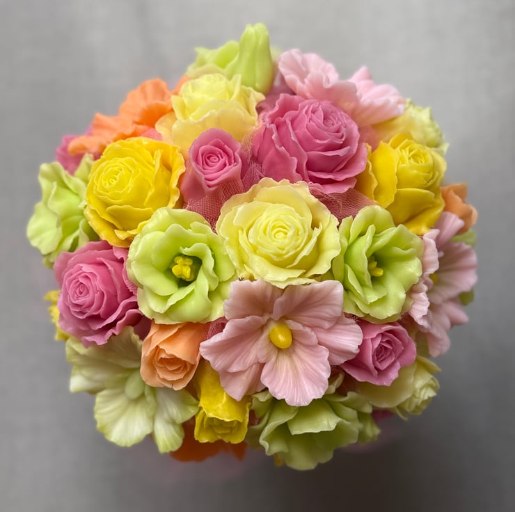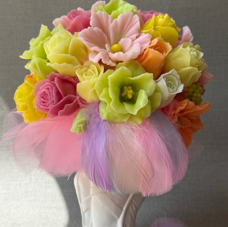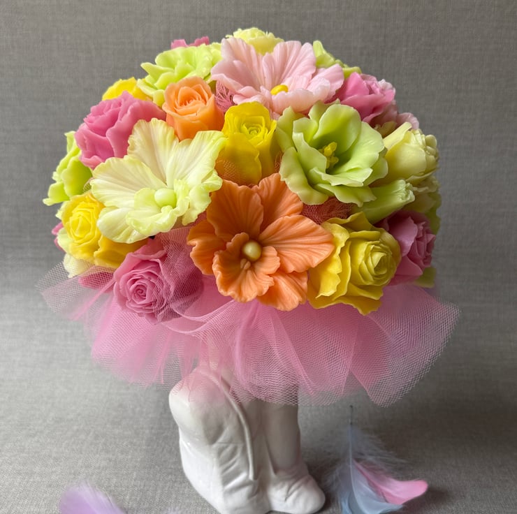 Celebrate the grace and elegance of ballet with this handcrafted floral arrangement, made entirely from delicately sculpted soap flowers. Each petal is formed by hand, creating a stunning bouquet that looks like fresh blooms but lasts for over a year and longer with care.