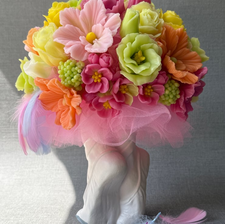 Presented in a beautifully detailed pointe shoe vase, made from high-quality hand-poured plaster and customisable in white, grey or black. No artificial greenery is used – only meticulously crafted soap flowers arranged to resemble a real floral display.