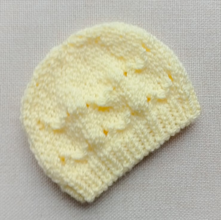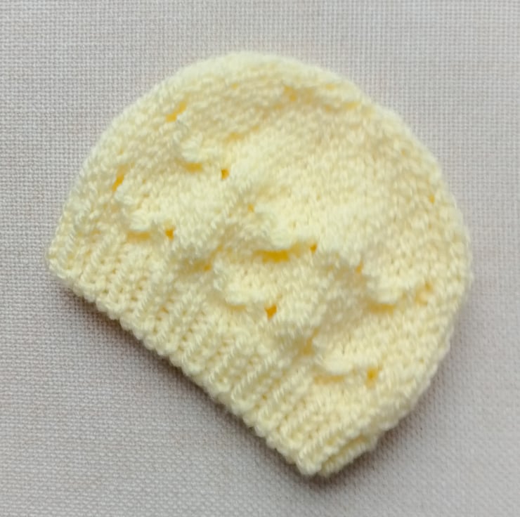 This hand knit PATTERN is for a hat. To fit age: 0-3 (6-9: 9-12) months and 1-2 (3-5) years. Circumference: 33 (37: 40: 43: 47) cm or 13 (14.5: 15.75: 17: 19) inches. Hat is knitted in chunky yarn using 5.5 mm and 6.5 mm knitting needles. It is knit flat and seamed.