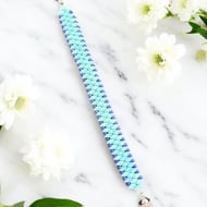 A beautiful, elegant bracelet made with Czechoslovakian glass beads in a gorgeous pearlescent pink. Hand stitched with galvanised silver Japanese glass beads.