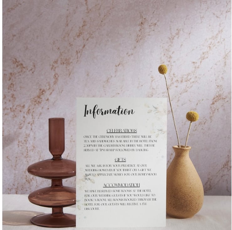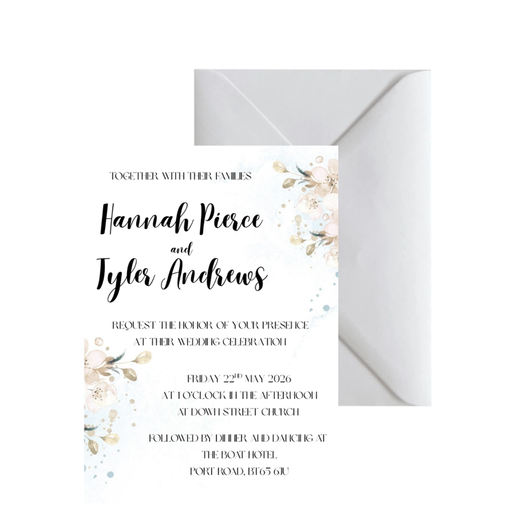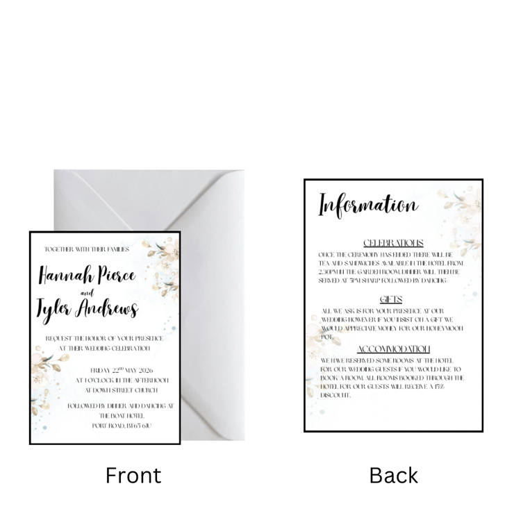 Once you have placed your order, you need to send over the personalised information as soon as possible. All information can be messaged across or included in an email. A digital copy will then be sent across to you for you to proof read that all details are correct before they are printed. This ensures that the invitations are personalised to your specific requirements and that any errors or omissions are caught before the invitations are printed.