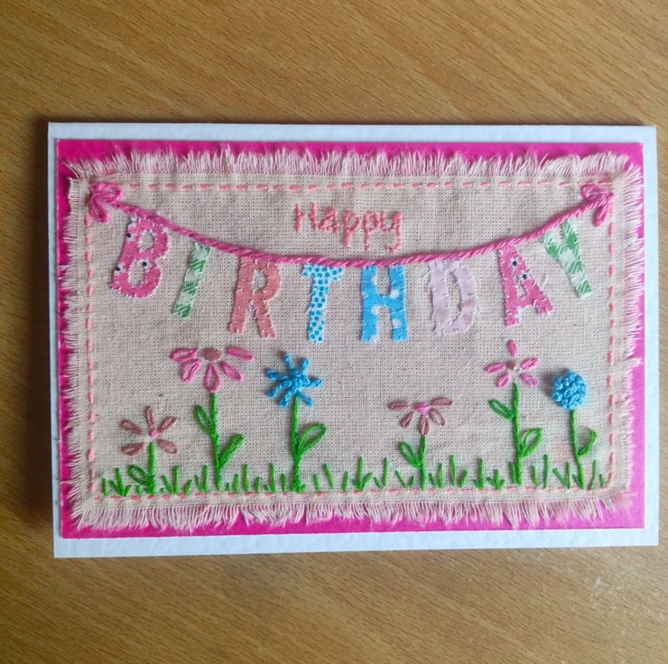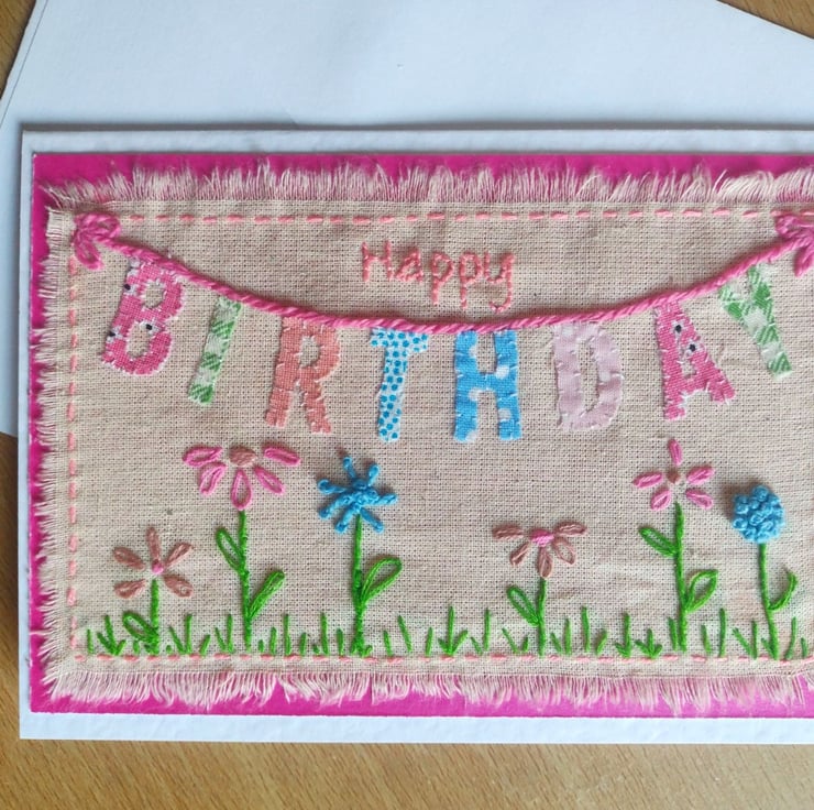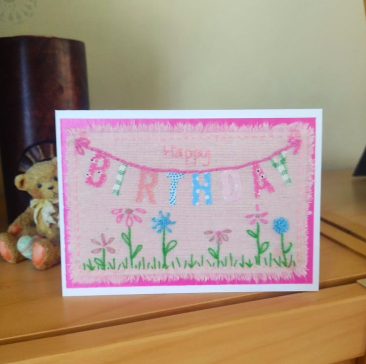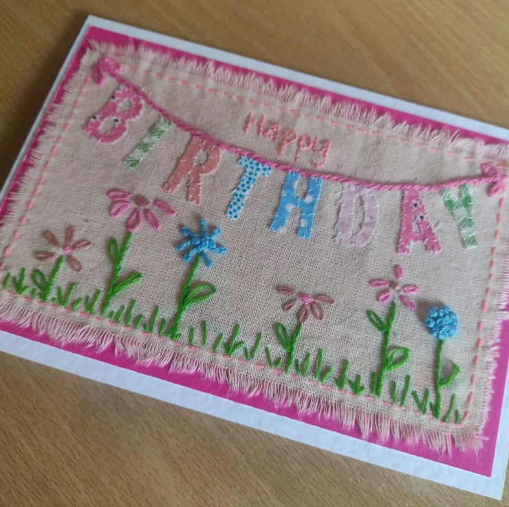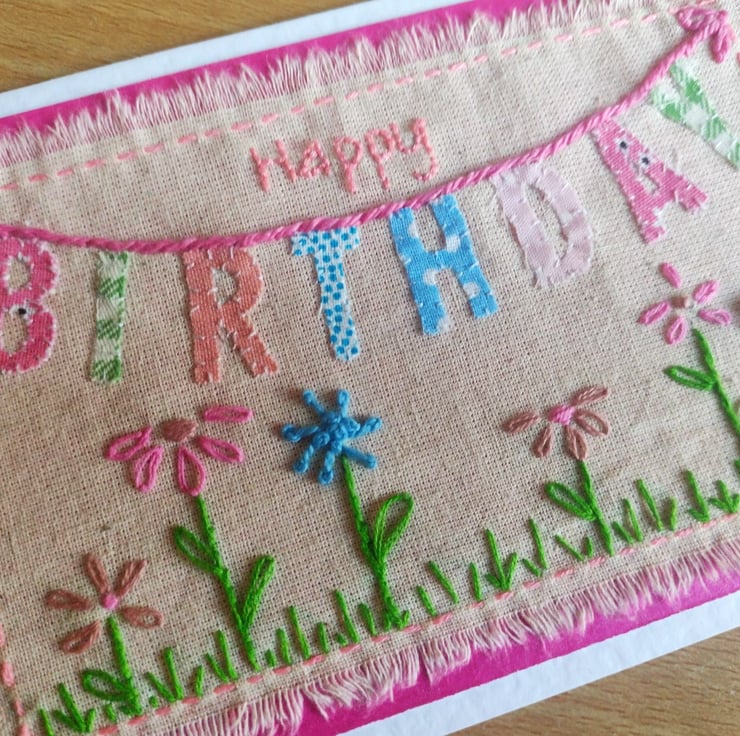 Hand-stitched applique "BIRTHDAY" text bunting design card, with embroidered details on a white raw edged fabric, layered onto bright pink pearlescent card and a white hammer textured A6 (105 x 148mm) folded card.