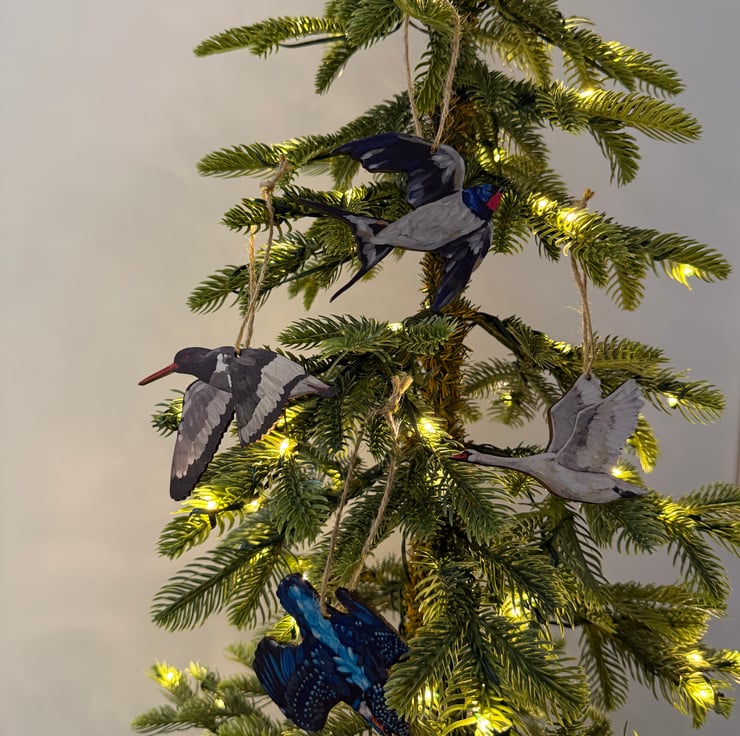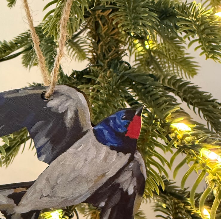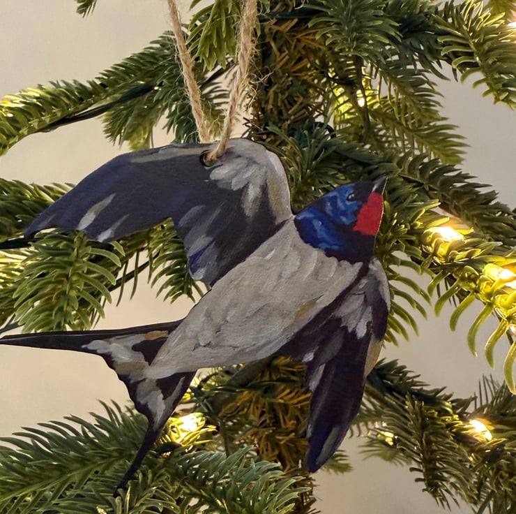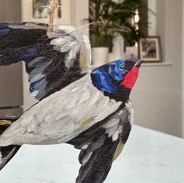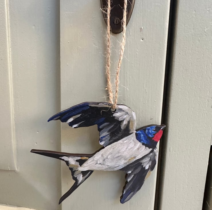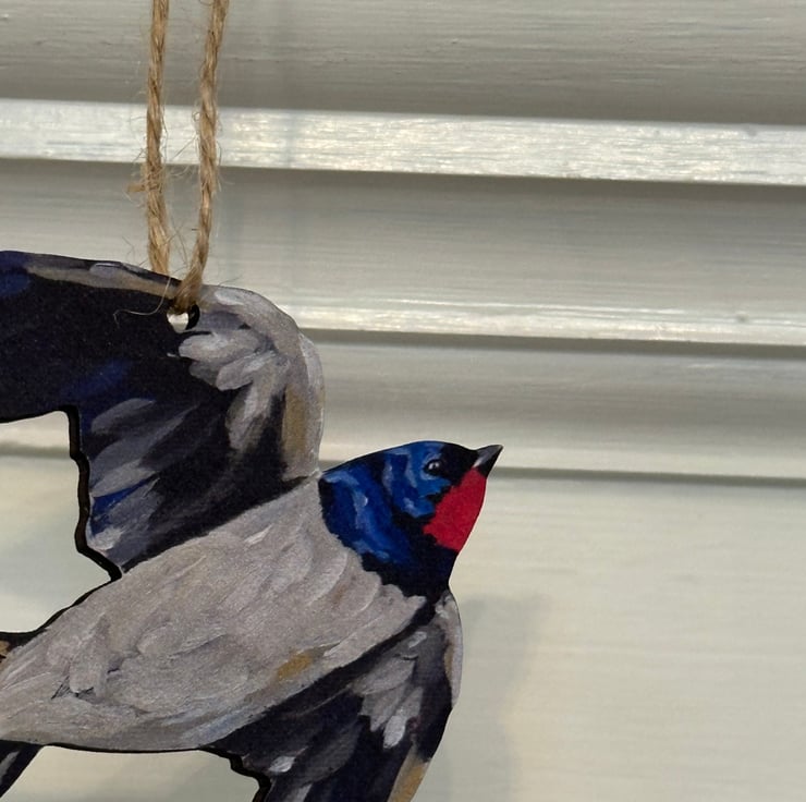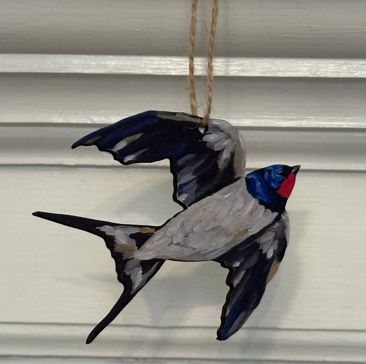 Beautiful hanging wooden decoration with original Swallow bird design from my original painting and laser cut to the outline of the swallow to make it look like a realistic miniature animal.