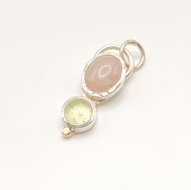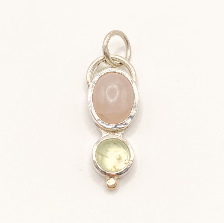 Soft pink rose Quartz with soft green prehnite wrapped in sterling silver. With a solid gold dot at the bottom of the prehnite.