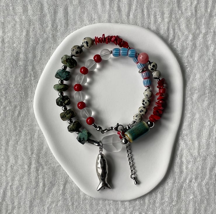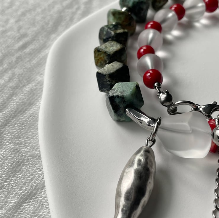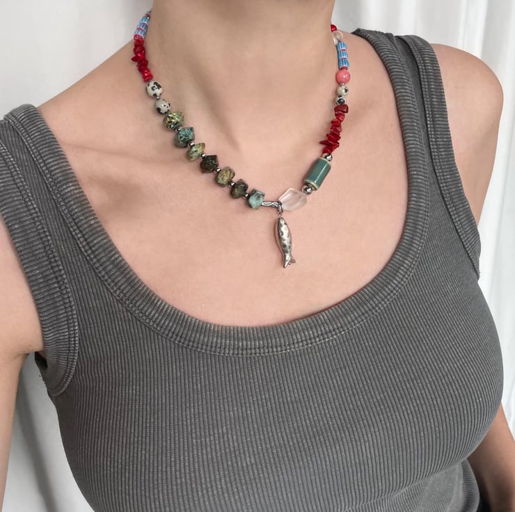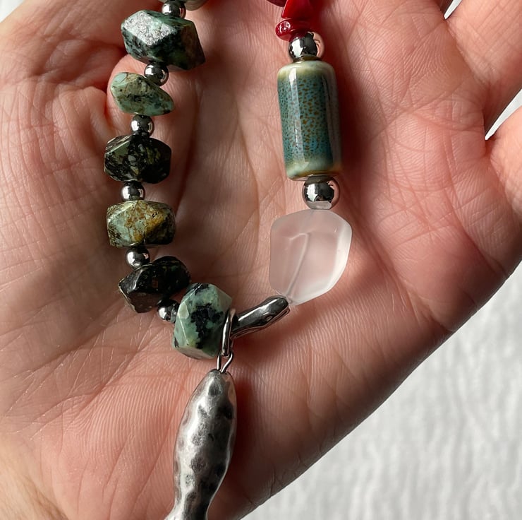This handcrafted high quality chunky necklace is made from African turquoise, coral stone, rhodonite, Dalmatian jasper, ceramic beads and stainless steel.