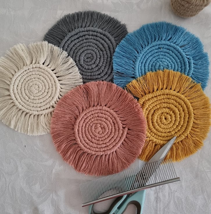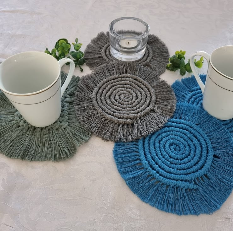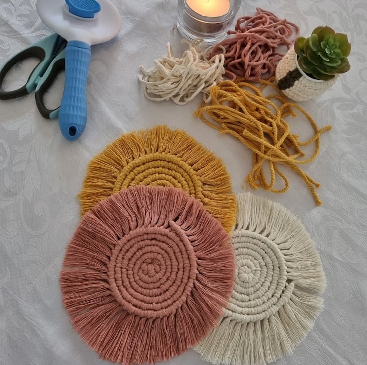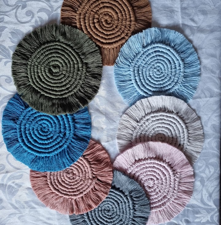 Macrame Coasters. These are adorable and handmade ! They are perfect for the living room, kitchen, office area, or any table you are trying to protect, they are also perfect for a valentine gift