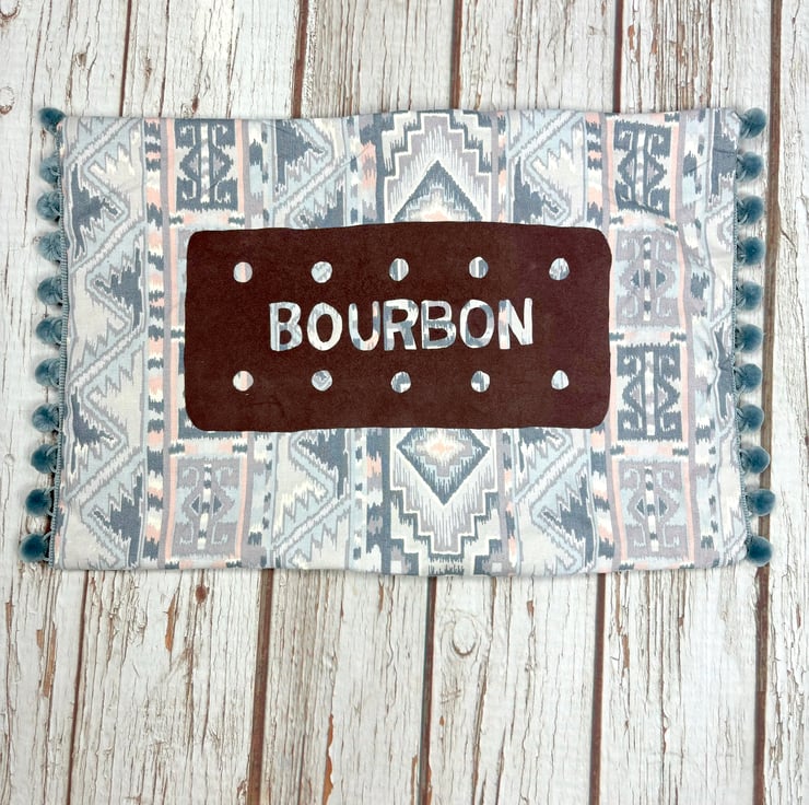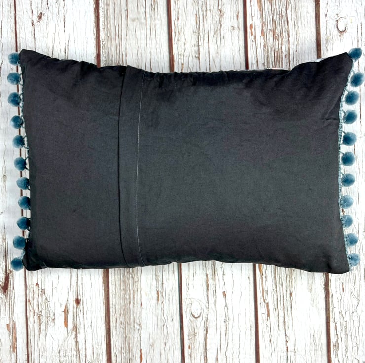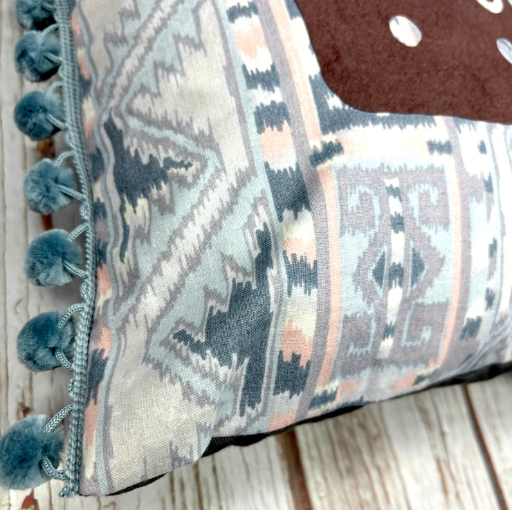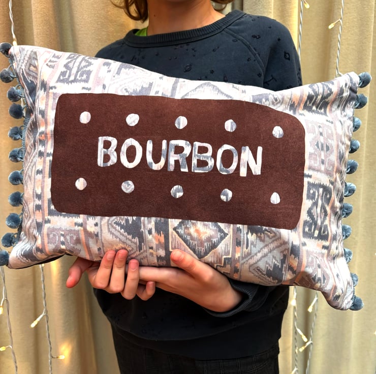 I've added our Bourbon Biscuit design to a handmade cushion using some of my vintage fabric stash! The biscuit design is added in brown flock. Fun & fluffy grey pompoms adorn two sides. The back panel is made using softer grey cotton with a zip to insert cushion or remove a cushion for washing.