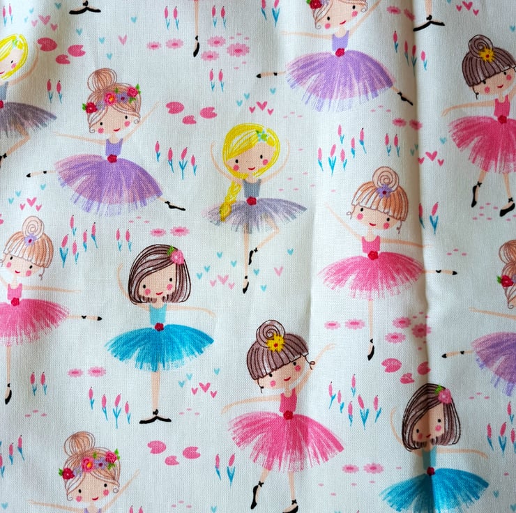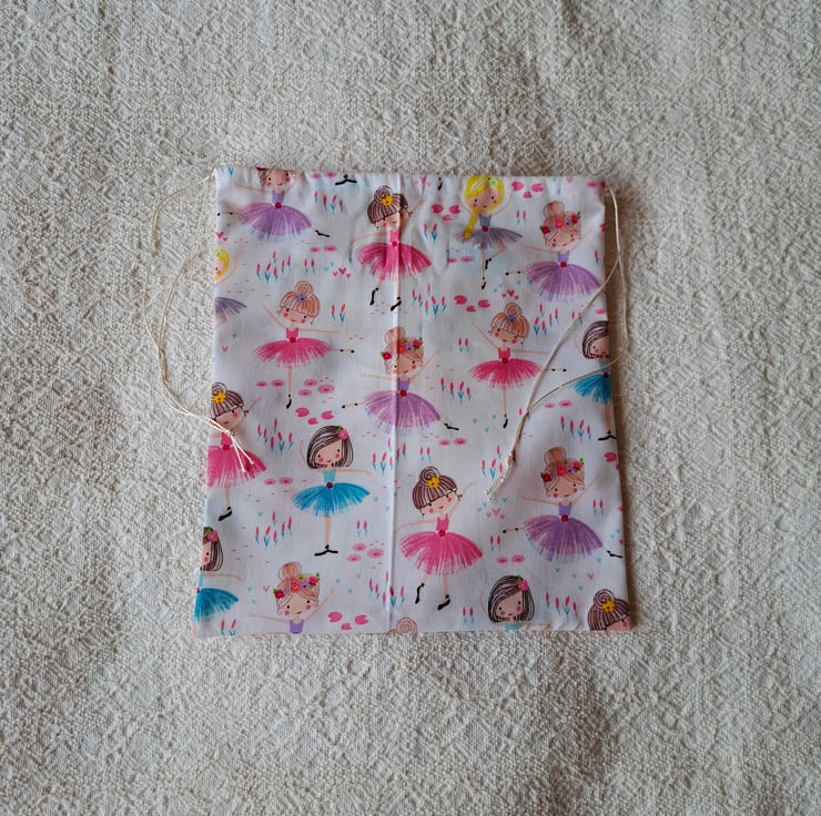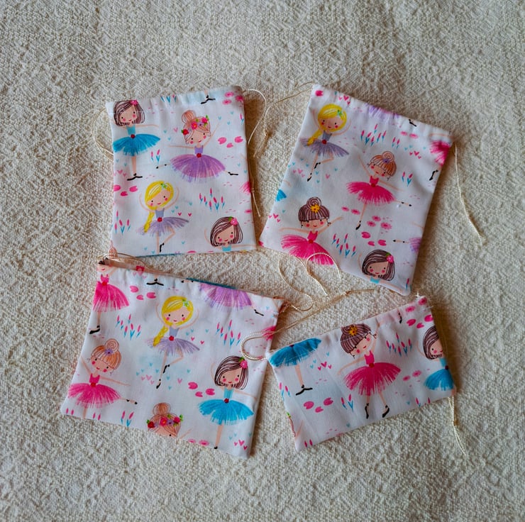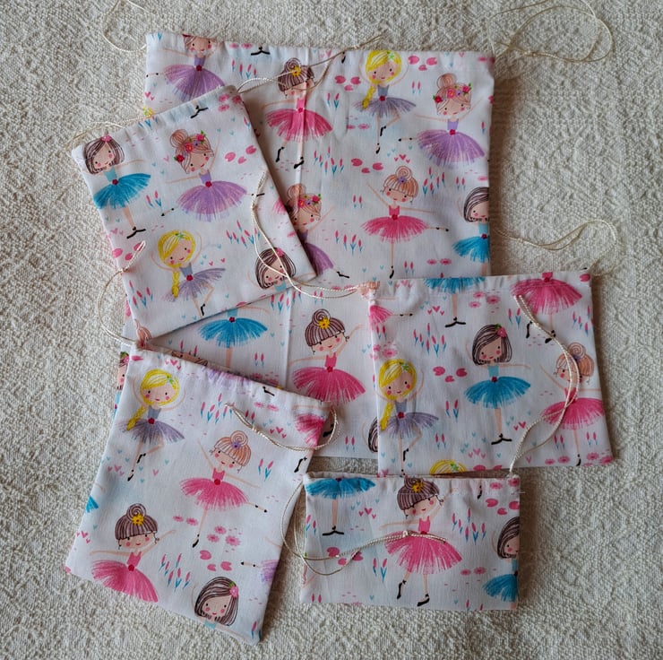 I have hand made a set of five drawstring gift bags from a pretty cotton material. Little ballet dancers wearing pink, mauve, grey or turquoise tutus pose on the fabric. The bags are washable and reusable. They are made from the bits and pieces left after I have finished cutting out aprons. The largest bag measure 10" (25 cm.) long by 8.5" (22cm.) wide, and the smallest just 3"(8 cm.) by 5" (13 cm.).