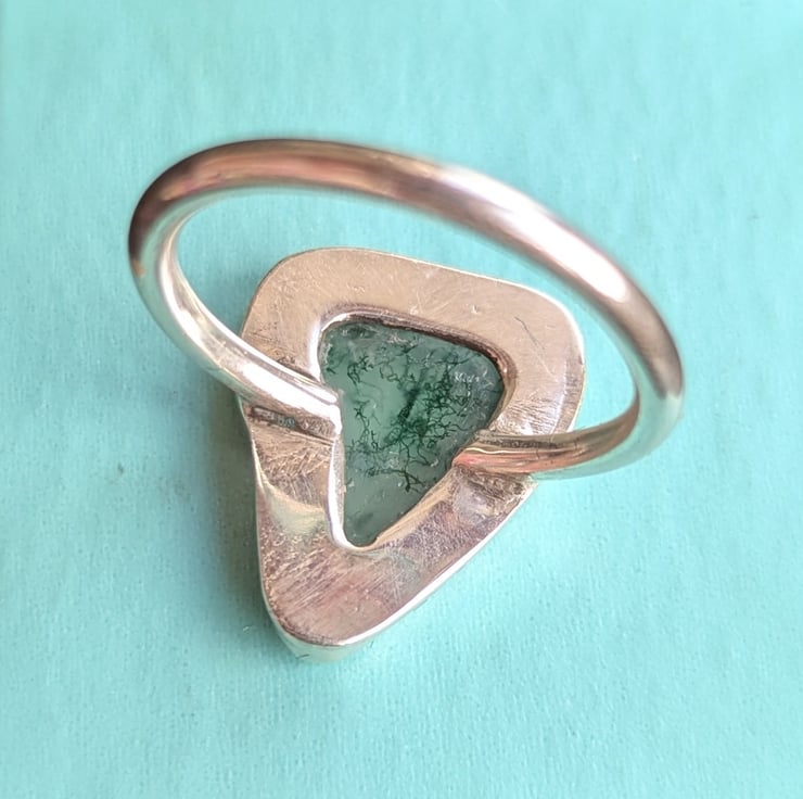 Handcrafted Sterling silver ring, with a custom bezel set moss agate natural stone. The back of the bezel is cut through, so the light can show the beautiful moss agate pattern in the stone. This is a one-off piece made to the natural shape of the stone. It has a handmade natural rustic finish where the bezel has been shaped around the shape of the stone. Ring Size R.