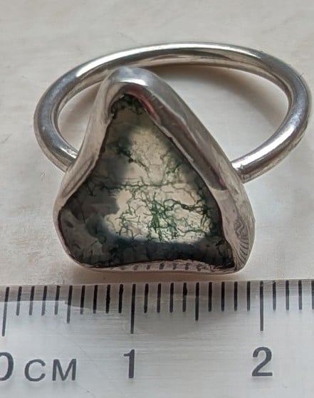 I love the natural shape of stones, and their beautiful interesting patterns. I usually make jewellery with stones that have been shaped - but this one is a natural shape and polished to show the beautiful moss-like inclusions. The shape and patterns of the stone inspired me to create a one-off bezel to show off the agate stone. I created a cut-out in the back of the bezel for the light to shine through and show off the lovely pattern. Look closely, and you'll see some natural marks on the stone, and the bezel is rustic where it has been shaped to the stone. This is a one-off piece, created with care. I use recycled sterling silver, and send the ring to you in a responsibly sourced gift box.