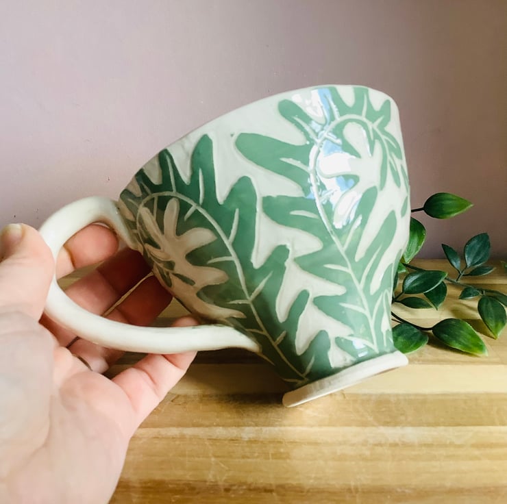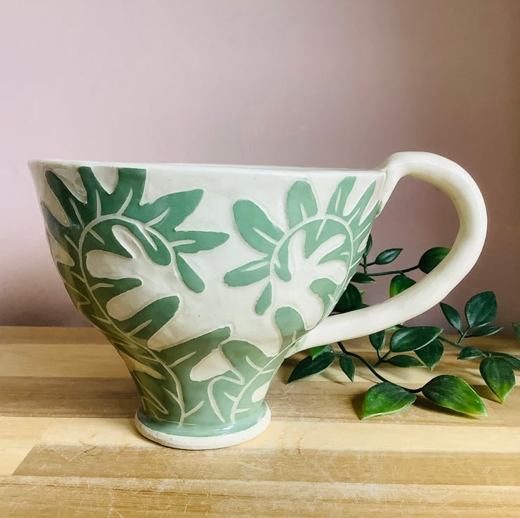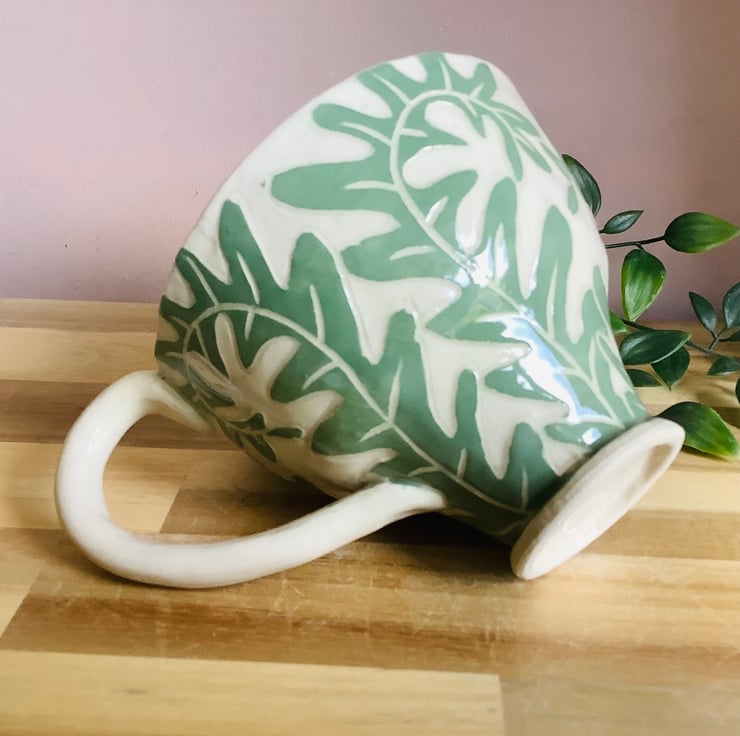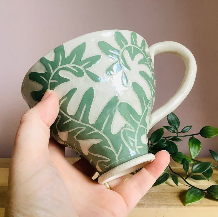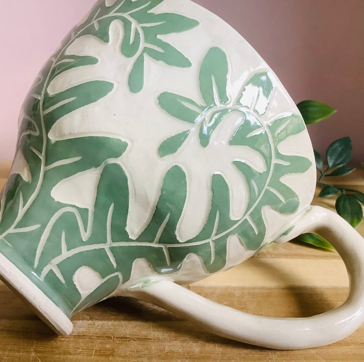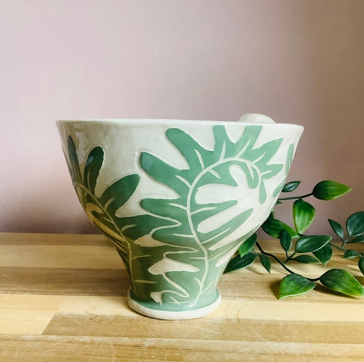 All of my pieces are decorated using sgraffito. This is where I layer up coloured slips to carve the pattern into. This gives each piece a lovely textural finish which you will love wrapping your hands around. Nature is my inspiration so each piece will have animals, organic shapes and plants spilling over their surfaces. I hand carve everything so each item is a little bit unique