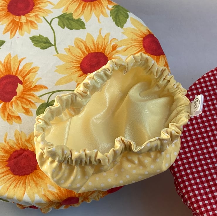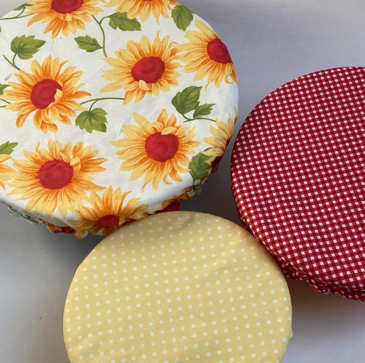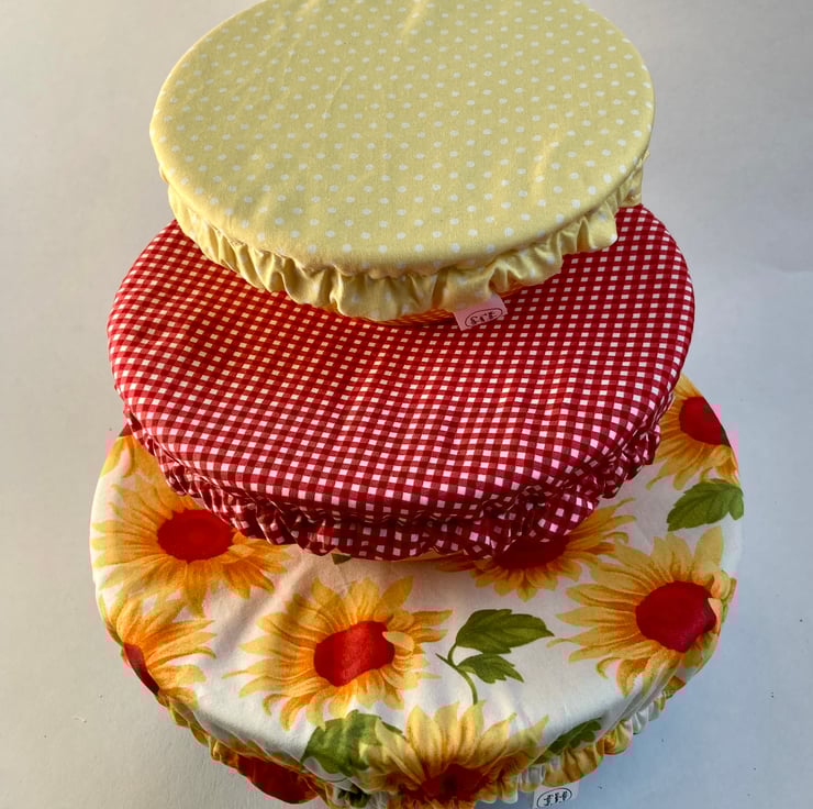 This set of 3 covers will fit bowls approximately 23cm, 19cm and 16cm (9", 7.5" and 6"). They are made from 3 coordinating fabrics featuring in sunny colours. They are lined with yellow PUL.