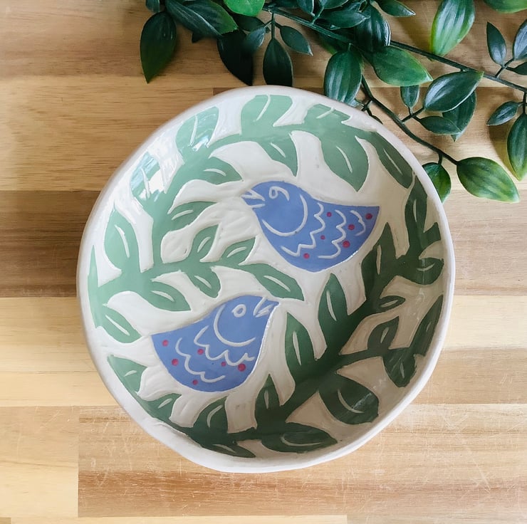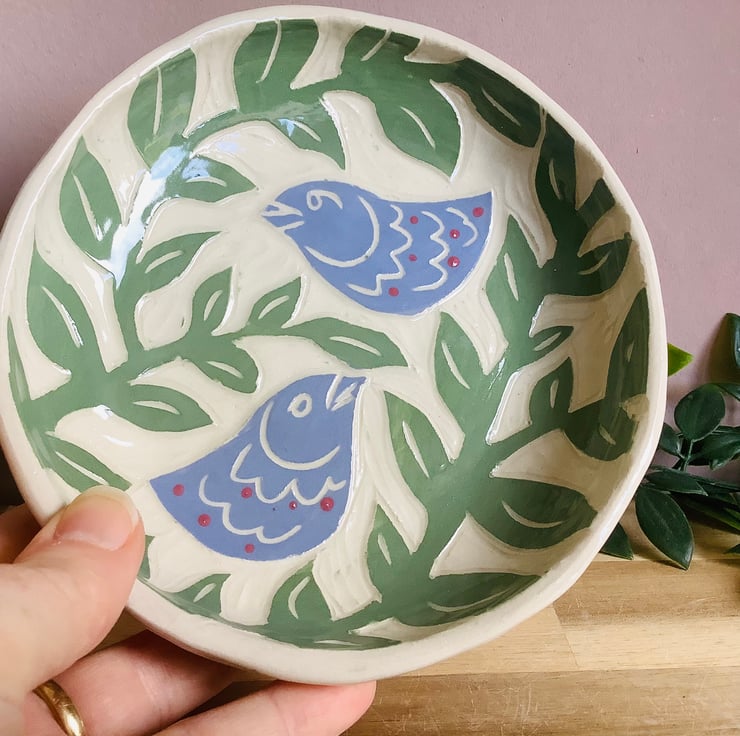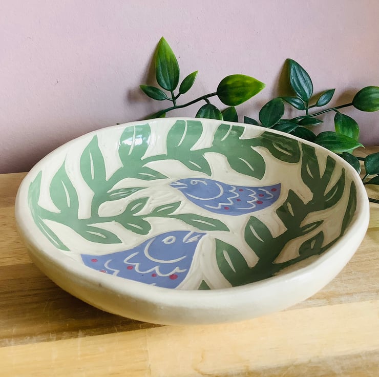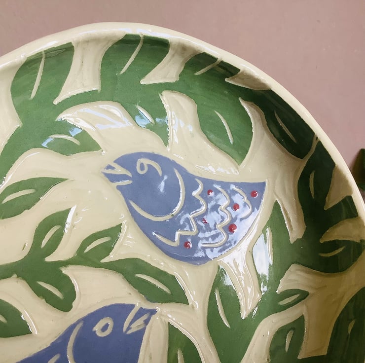 All of my pieces are decorated using sgraffito. This is where I layer up coloured slips to carve the pattern into. This gives each piece a lovely textural finish which you will love wrapping your hands around. Nature is my inspiration so each piece will have animals, organic shapes and plants spilling over their surfaces. I hand carve everything so each item is a little bit unique