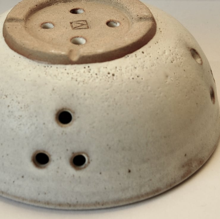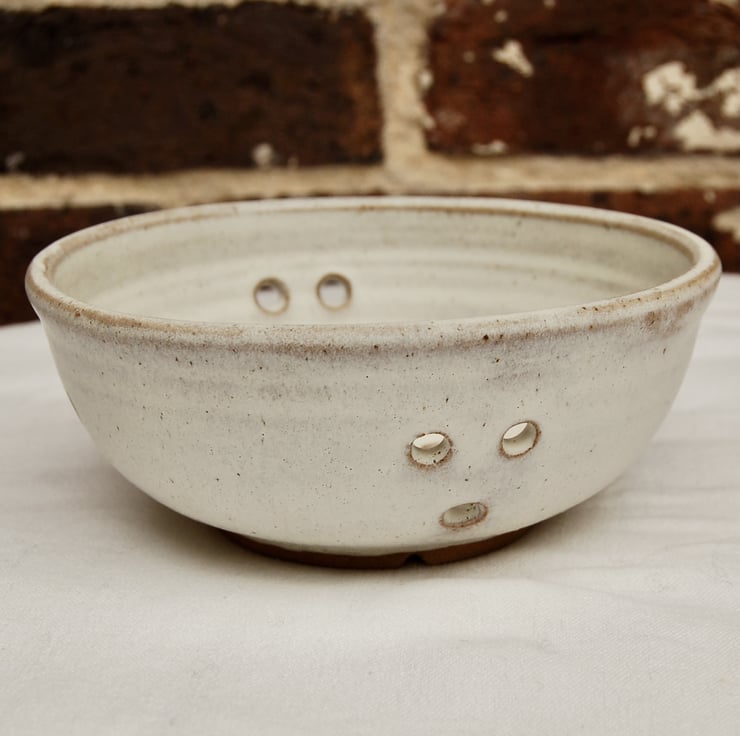 Small pierced bowl to serve washed fruit or drained olives. Toasted clay under a rustic ivory coloured satin glaze. Dishwasher safe. Foodsafe glaze. A nice gift as is a unique item.