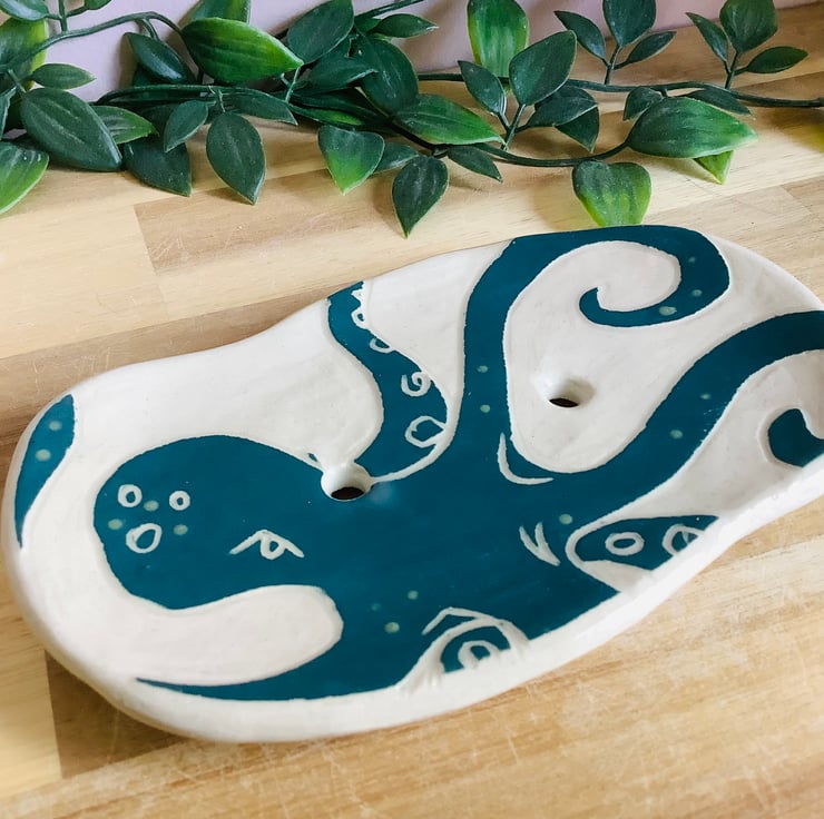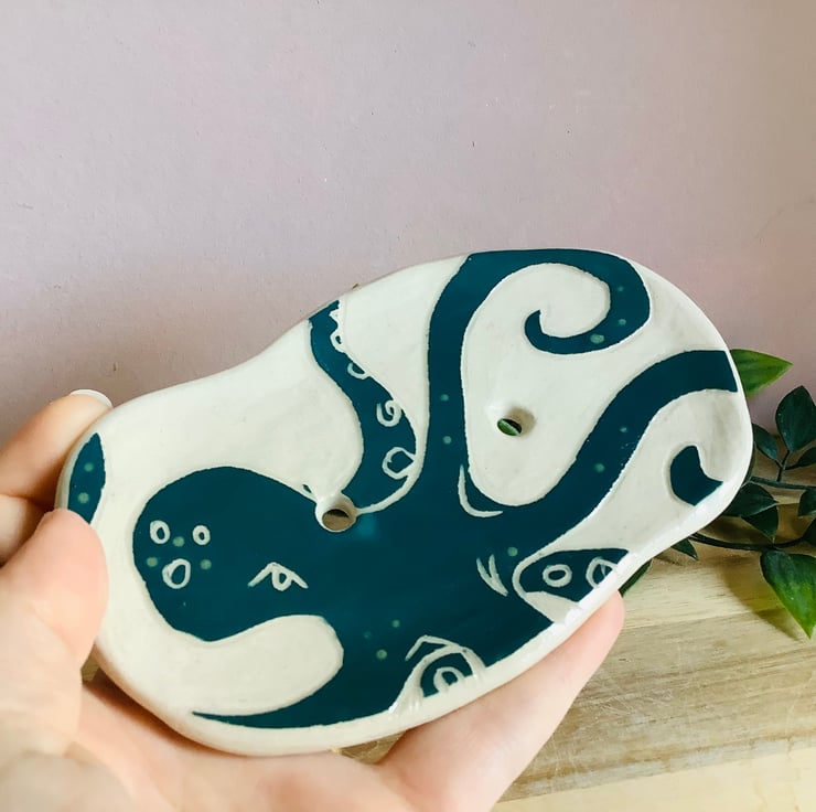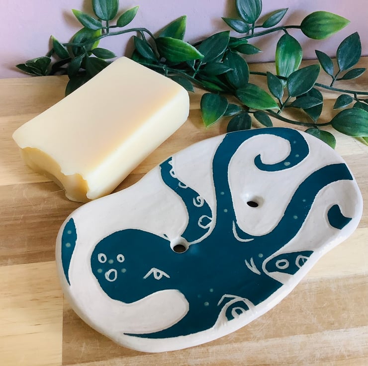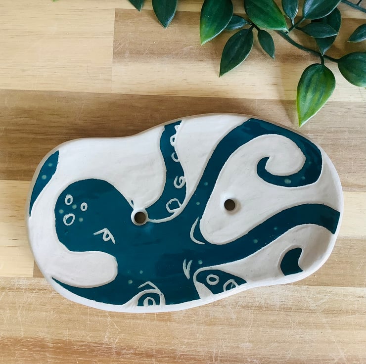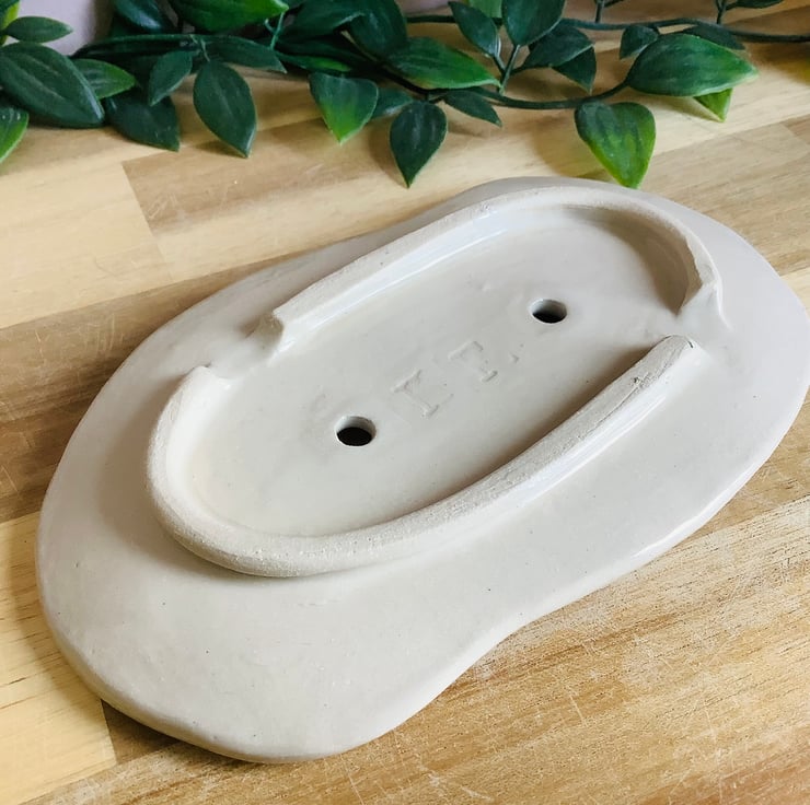 Handmade stoneware sgraffito soap dish with two drainage holes for use inside or outside, dishwasher and frost proof