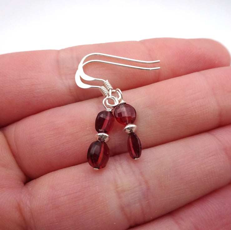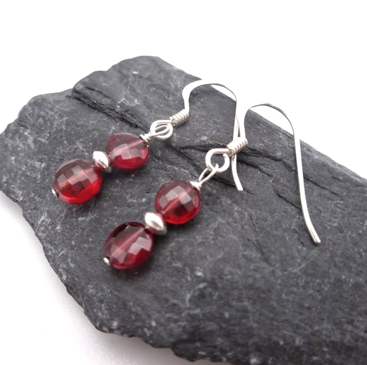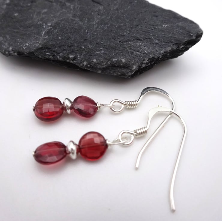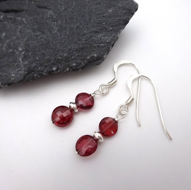 A pair of sterling silver earrings that feature Grade AA Garnet gemstone beads and silver disc beads.