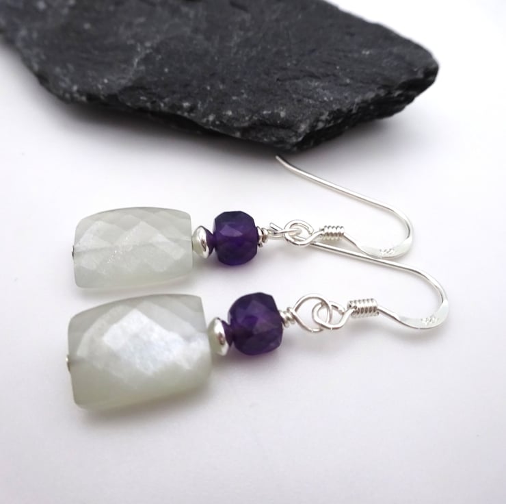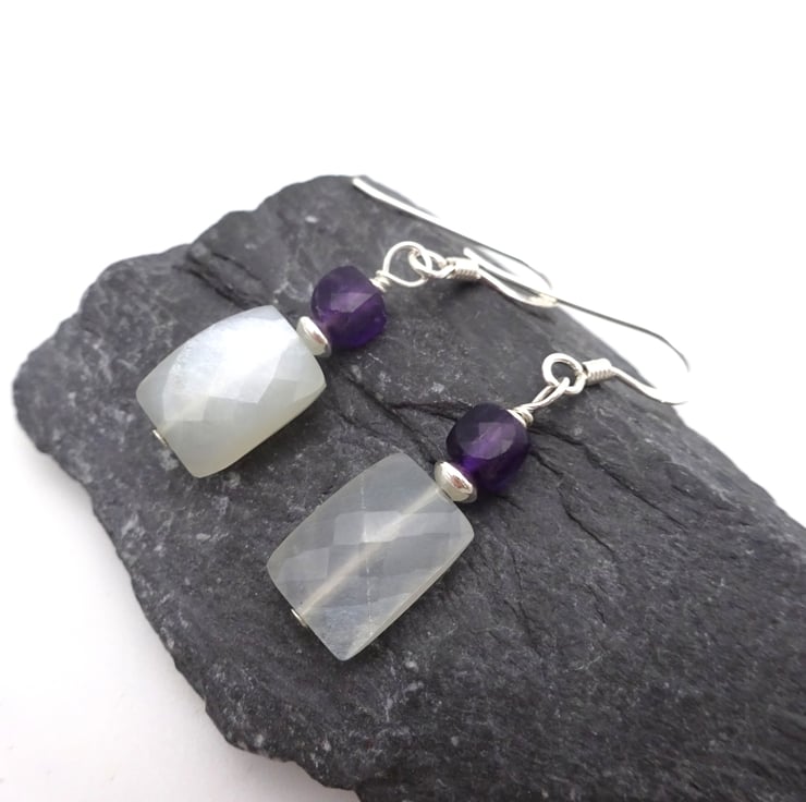 A pair of sterling silver earrings made with sterling silver disc beads and Grey Moonstone and Amethyst gemstone beads.