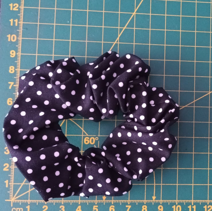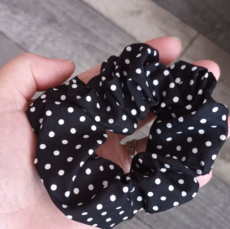 A lovely black and white polka dot scrunchie. I also have these in other colours in my shop. 100% cotton.
