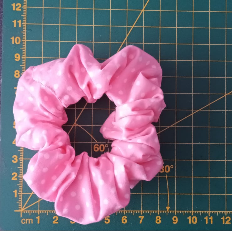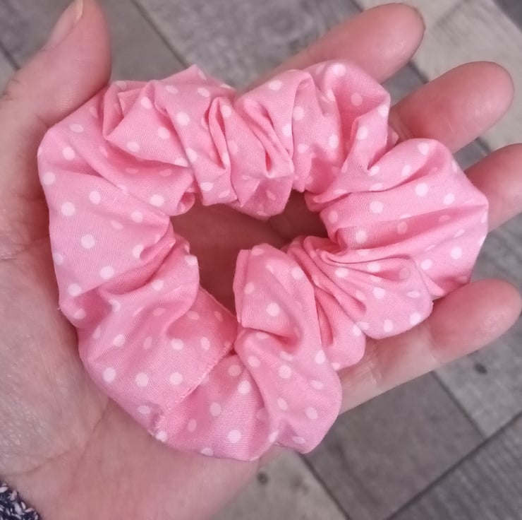 A lovely pink and white polka dot scrunchie. I also have these in other colours in my shop. 100% cotton.