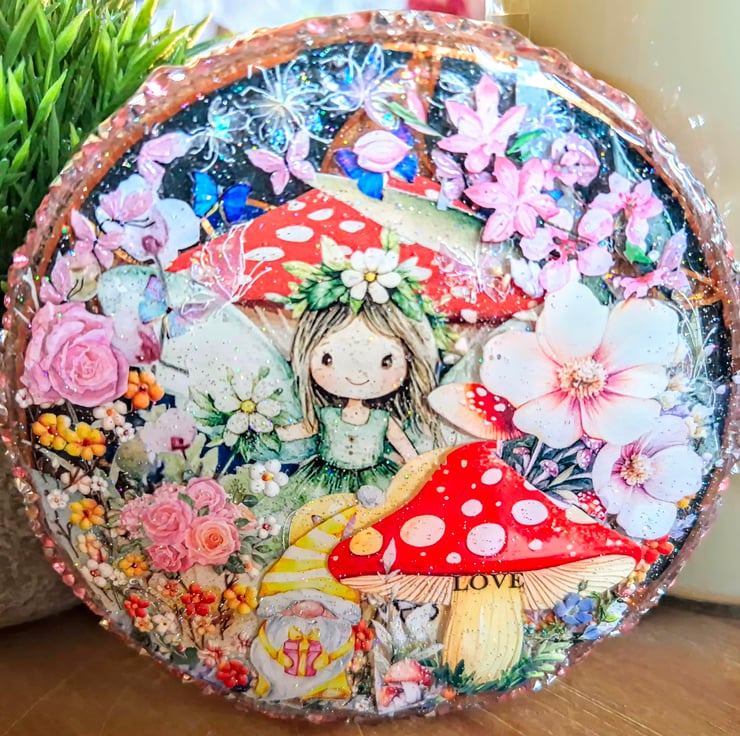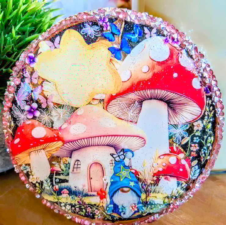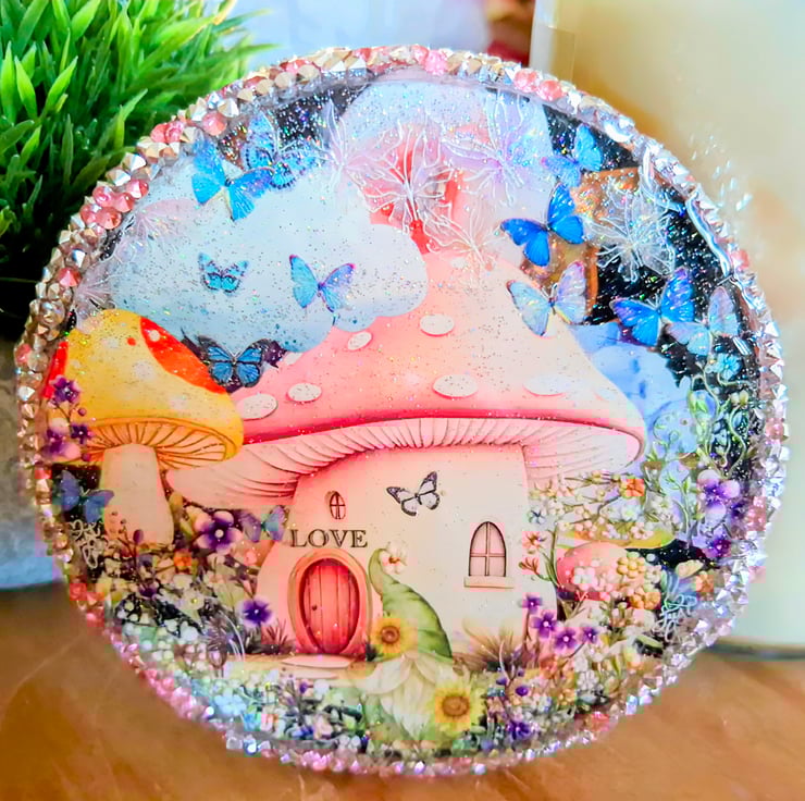 Handmade and designed by me. This is a magical fairy, toadstool houses and gnomes set of 4 coasters. I have trimmed them with pink and silver crystals.