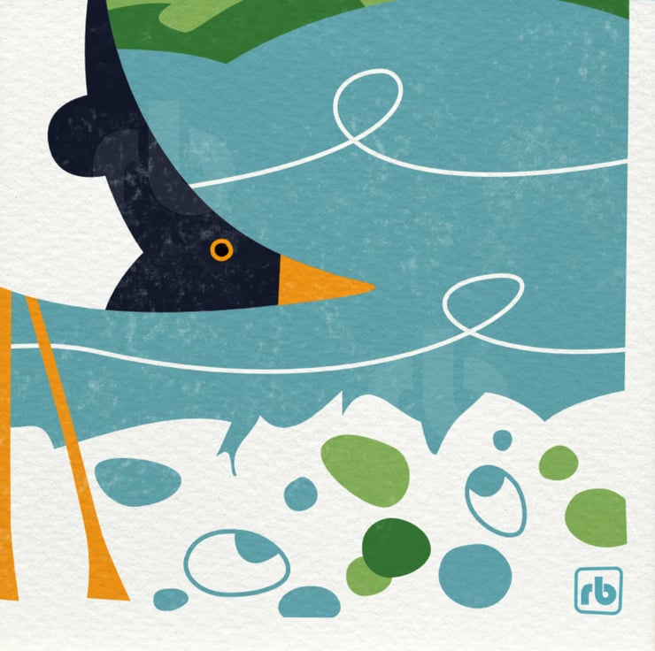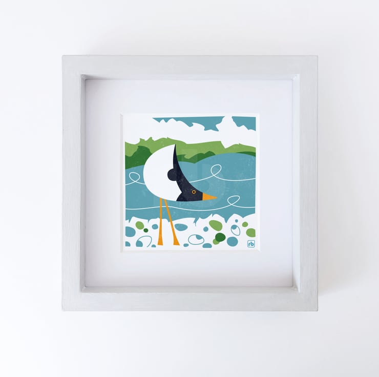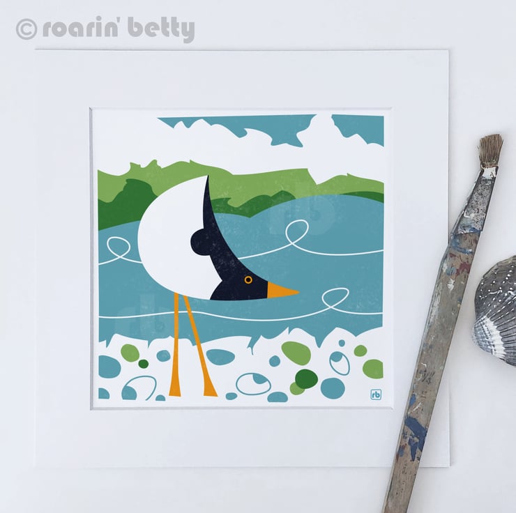 Graphic illustration of an Oystercatcher foraging amongst the pebbles at low tide.