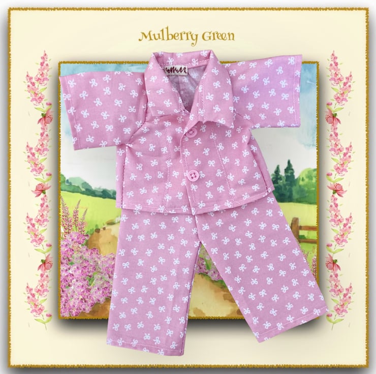 A lovely little pair of pink pyjamas in a tiny bow print, to fit the Mulberry Green characters. The pyjamas are made from cotton and are tailored like real pyjamas. They fasten with poppers under two little buttons.