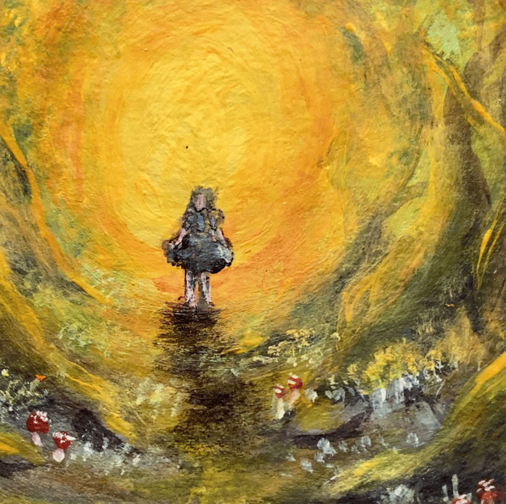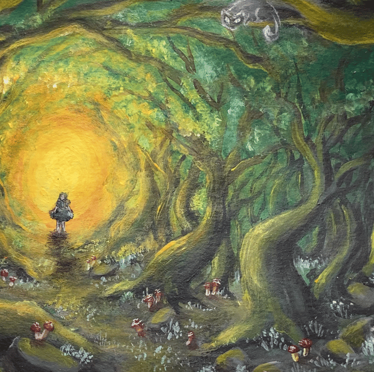 I love to create a familiarity in my artwork through the recognisable characters and strong symbols associated with Alice in Wonderland, whilst also giving it a mysterious and almost longing feeling.