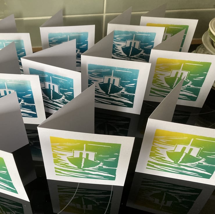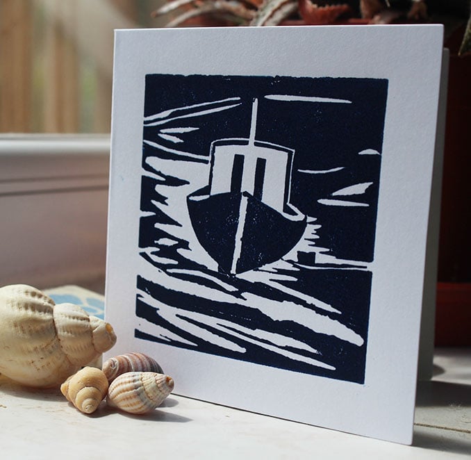 This is a handprinted boat linocut on a 10cm (4") bright white 250gsm card with envelope. It is supplied in a compostable wrap. Please choose which colour version you would like from the drop-down menu.