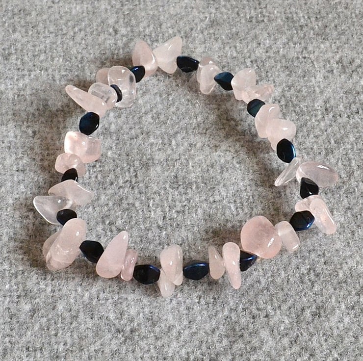 I really cannot overstate how shiny the 5mm blue pinch beads are when they catch the light. They contrast beautifully with the pale pink of the rose quartz chips. This bracelet measures approximately 19cm (7 1/4 inches) unstretched and is strung on jewellery elastic for easy fit.