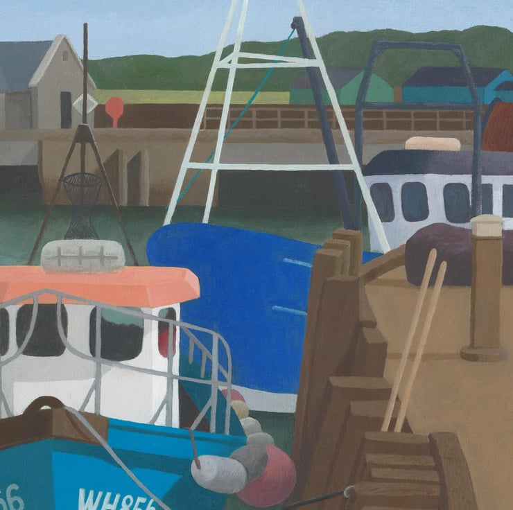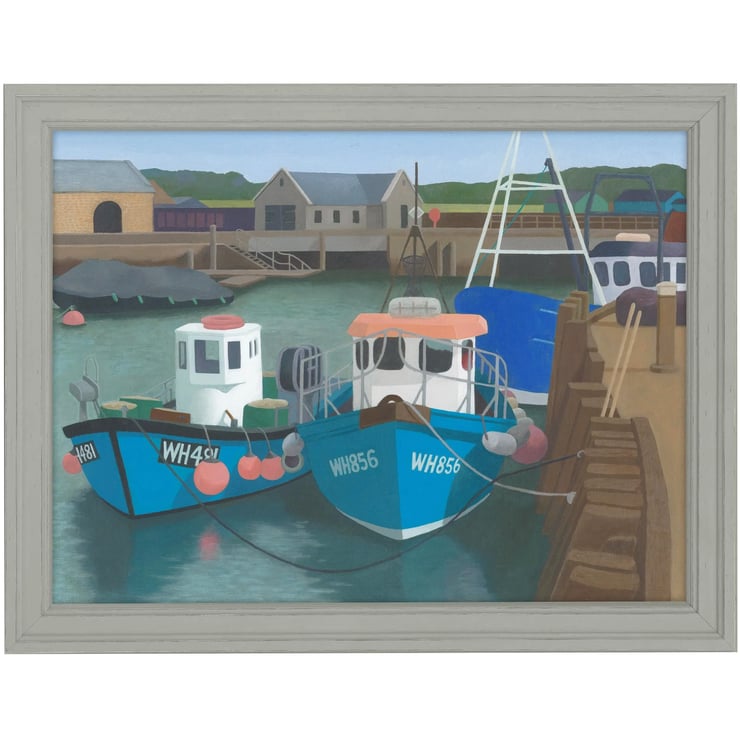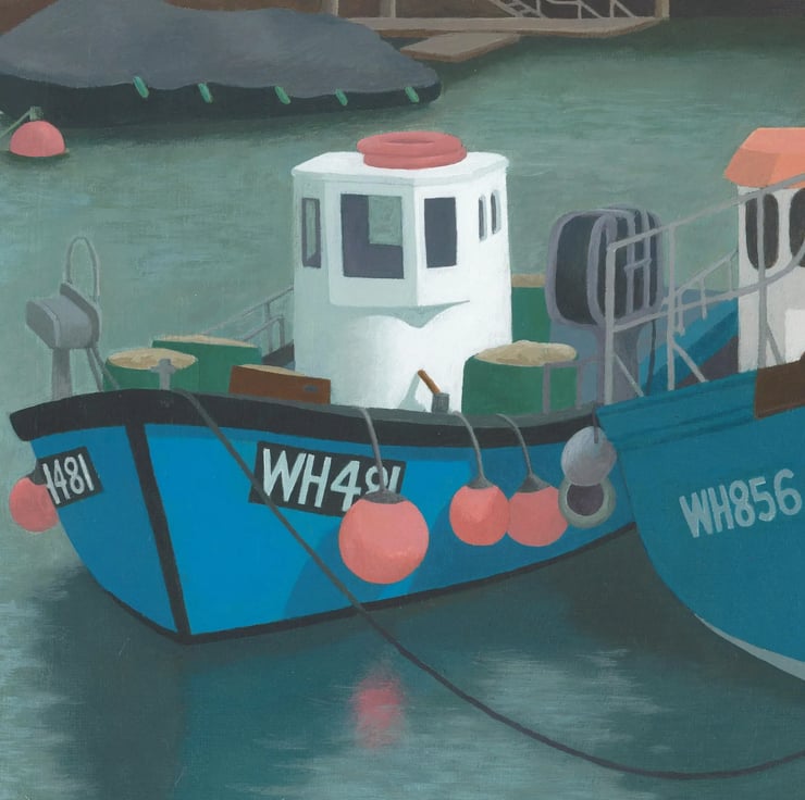 A painting of two fishing boats in West Bay Harbour in Dorset.