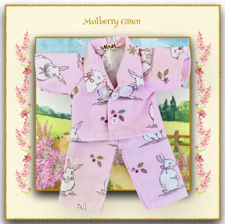 A lovely little pair of pink pyjamas in a rabbit print, to fit the Mulberry Green characters. The pyjamas are made from polyester cotton and are tailored like real pyjamas. They fasten with poppers under two little buttons.